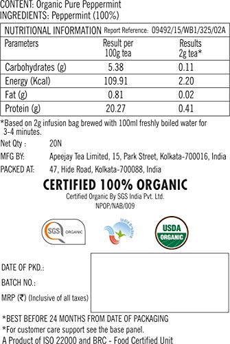 Not pure peppermint, it is artificial flavour. We used to grow our own peppermint, and tasting this one instantly put my mind off. Deceiving brand and not worth the price. Real peppermint tea is bitter, this one tastes exactly like peppermint chewing gums which have only the flavour, not organic peppermint.