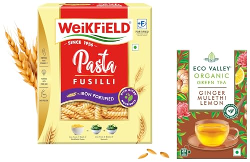 Weikfield Fusilli Pasta 100% Durum Wheat Semolina - No Maida 400g & Eco Valley Organic Green Tea - Ginger Mulethi Lemon - 25 Tea Bags - Pack of 2