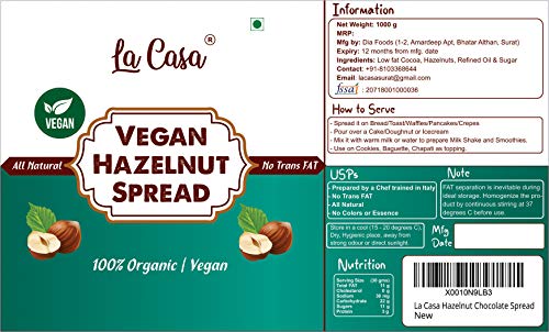 La Casa Hazelnut Chocolate Spread | Vegan | All Natural | Hazelnut Ganache | No Colors/Essence/Preservatives Used | 1 Kg |