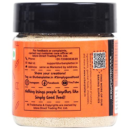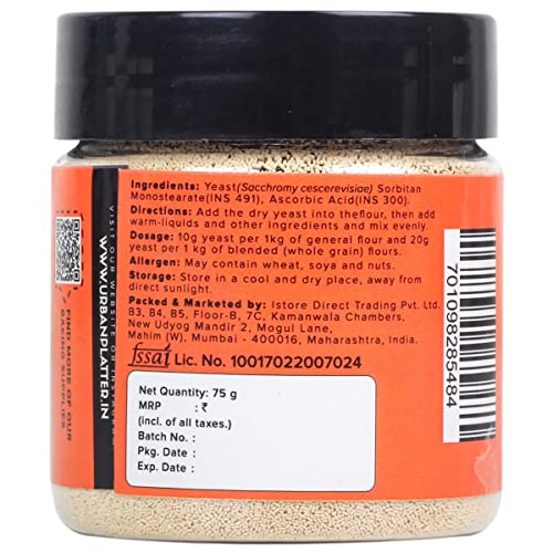 (Commercial Grade) Active Dry Yeast 75g Can be used for baking proofing making wine beer or even for some South Indian preparations. Long shelf life of 18 Months. If stored in a cool dry place will last more than that. How-to-use: 2 tea spoons of Yeast to warm (not hot) water along with 2 tea spoons of Sugar. Stir well set aside for 10 minutes. Use once the yeast is foamy and activated. - Simply Good Food! :)