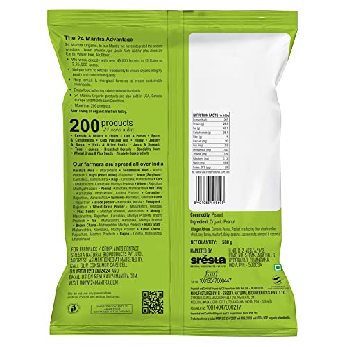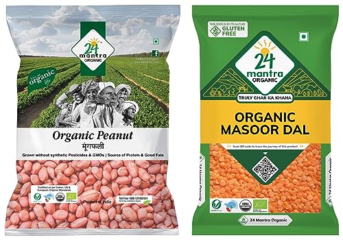 24 Mantra Organic Raw Peanut 500gPeanuts are an excellent and affordable source of nutrients. Peanuts are rich sources of oil 40-50 % therefore energy-dense. Along with calories peanuts are a good source of protein and dietary fiber. 24 Mantra Organic Raw Peanuts are a source of important nutrients such as proteins carbohydrates lipids vitamins minerals antioxidants and fiber. Raw Peanuts are a good source of many minerals for example potassium copper magnesium manganese zinc and selenium. Raw Peanuts also provide Vitamin E and B vitamins such as niacin pantothenic acid pyridoxine and folate.24 Mantra Organic Unpolished Masoor Dal/Red Lentil - 500 gms | 100% Organic | Chemical Free & Pesticides Free | Tastier & Rich FlavourPulses are a boon to vegetarians and vegans. Our 24 Mantra Organic Masoor Dal organic is unpolished unadulterated good source of macro and micronutrients along with dietary fiber! 24 Mantra Masoor Dal is a good source of plant protein. The compounds present in 24 Mantra Organic Masoor Dal organic are beneficial for managing and preventing chronic diseases. Unpolished 24 Mantra Organic Masoor dal contains dietary fiber which has several health benefits.