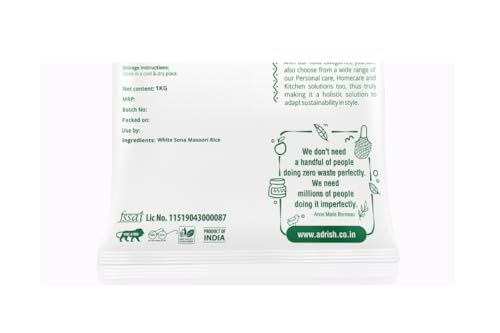 Adrish Zerowaste Organic Sona Masuri White Rice (1kg) - White Sona Masuri Loose Rice| Handpounded Sona Masoori Rice | Gluten Free | Traditionally Milled Rice | Suitable for Daily Cooking