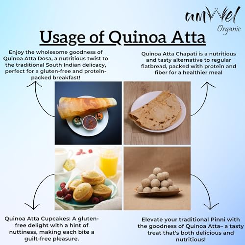 Who says health is Boring?? Give all your recipes a healthy ingredient and replace it with refined flour and see the magic. Eat Healthy!! Stay Healthy!! Get the benefits from the super flours!! Make your english breakfast with traditional Quinoa Atta and make it super healthy!! POWER OF QUINOA : Quinoa is a powerhouse of Protein the best plant-based protein source. Quinoa is packed with all the essential minerals and nutrients required for a healthy body. PROVIDE ANTIOXIDANTS YOUR BODY NEEDS : Quinoa contains flavonoids which have powerful antioxidant & anti-inflammatory effects on the body. it contains essential amino acids that our bodies cannot make on their own. TAKE GOOD CARE OF YOUR GUT HEALTH : Quinoa is high in fiber. Adding more fiber-rich foods into your diet can help support gut health body weight maintenance and improves digestion. ADOPT GLUTEN FREE LIFESTYLE : Quinoa is gluten free in nature and hence it can be consumed by those allergic to gluten (wheat) or are adopting gluten-free lifestyle. MAKE MULTI-CUISINE RECIPES: Quinoa not only is a protein powerhouse but also absorbs so many different flavors and adds a unique texture to our favorite dishes like quinoa tacos quinoa salad & more We at amwel aim to help you have a healthy and wholesome lifestyle by presenting our range of healthy staple foods. Each product nurtures an old age secret of good health and better immunity. Let these superfoods of nature restore its magical and healing balance book into your bodies. DIRECT FROM MANUFACTURER : We ship freshly manufactured traditionally stone grounded Quinoa Atta making sure that all the essential nutrients remain intact. ADD TO CART NOW