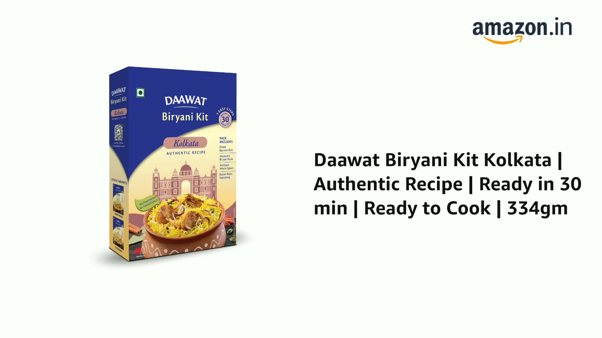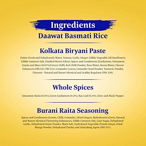 India's finest Basmati brand Daawat brings to you the finest Biryani Kit DAAWAT BIRYANI KIT. Now cook delicious Biryani at home in just 30 minutes and satisfy your anytime Biryani cravings! Daawat Biryani Pastes are made fresh from scratch with choicest ingredients to ensure that we do justice to the rich heritage of the wholesome dish - Biryani. To take your experience a notch higher this pack comes with the finest Basmati Rice from Daawat and Burani Raita seasoning to serve. Available in range of authentic variants Daawat Hyderabadi Biryani Kit Daawat Lucknowi Biryani Kit & Daawat Kolkata Biryani Kit.