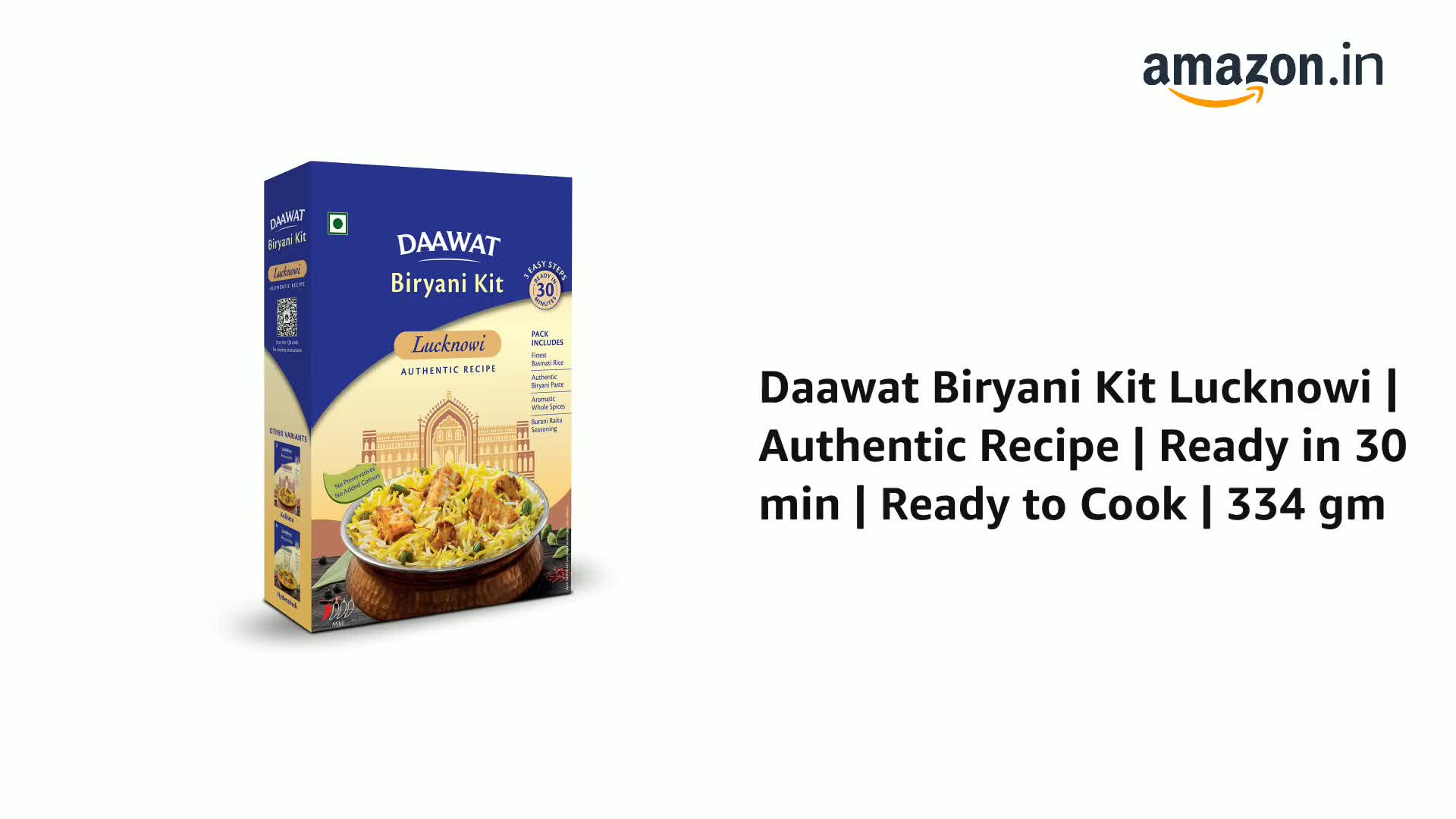 India's finest Basmati brand Daawat brings to you the finest Biryani Kit DAAWAT BIRYANI KIT. Now cook delicious Biryani at home in just 30 minutes and satisfy your anytime Biryani cravings! Daawat Biryani Pastes are made fresh from scratch with choicest ingredients to ensure that we do justice to the rich heritage of the wholesome dish - Biryani. To take your experience a notch higher this pack comes with the finest Basmati Rice from Daawat and Burani Raita seasoning to serve. Available in range of authentic variants Daawat Hyderabadi Biryani Kit Daawat Lucknowi Biryani Kit & Daawat Kolkata Biryani Kit.