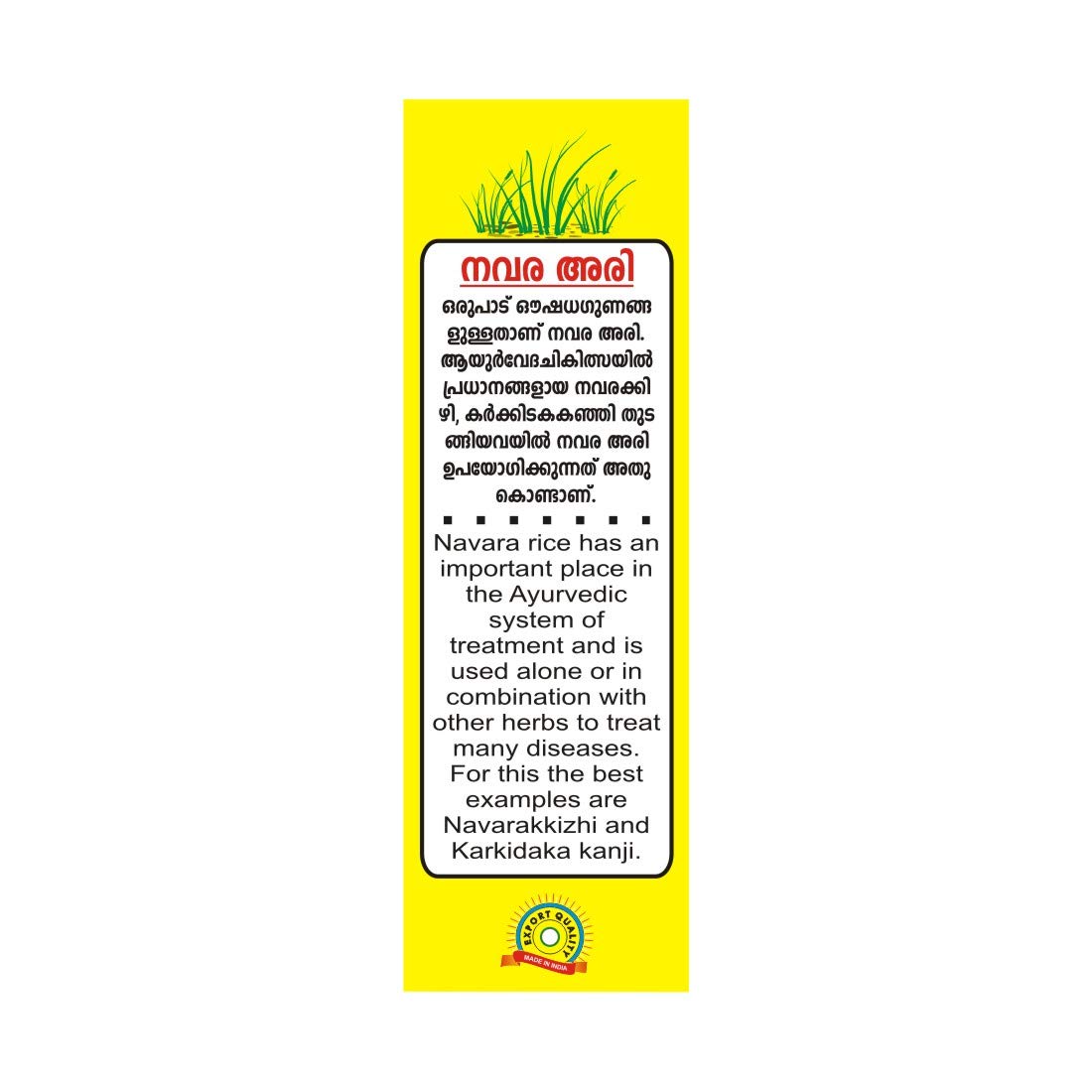 Navara rice has an importent place in the Ayurvedic system of treatment and is used alone or in combination with other herbs to treat many diseases. For this the best examples are Navarakkizhi and Karkidaka kanji.