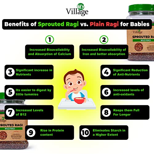 My Village Sprouted Wild Ragi is a 100% Natural and Organic food product. This type of Ragi is grown in the wild and collected by tribal people of the western ghats of Kerala. So the nutrient values will be higher than normally grown ragi. Contains washed and sprouted Ragi - nothing else. Ragi is finger millet which is high in protein and minerals in comparison to all other cereals and millets. Also a source of protein it is a perfect food for babies vegetarians Bodybuilders the Aged etc. Finger millets contain important amino acids—isoleucine leucine methionine and phenylalanine which are not present in other starchy meals. It has the highest amount of calcium and potassium. Ragi is a great source of iron making it beneficial for individuals with low hemoglobin levels. It is good for the stomach and for good digestion. We sorted and washed quality ragi grains. Allow wet ragi for 2-3 days. So the sprouted grains spread out in the sunlight for 5 to 8 hours to dry. Millets also contain B vitamins especially niacin B6 and folic acid. Some of the health benefits of ragi are attributed to its polyphenol and dietary fiber contents. Ragi possesses anti-diabetic and antioxidant and antimicrobial properties; it protects against tumors and atherosclerosis. Low in fat and gluten-free ragi is easy to digest. It is therefore given as the first food to babies in the form of ragi porridge.