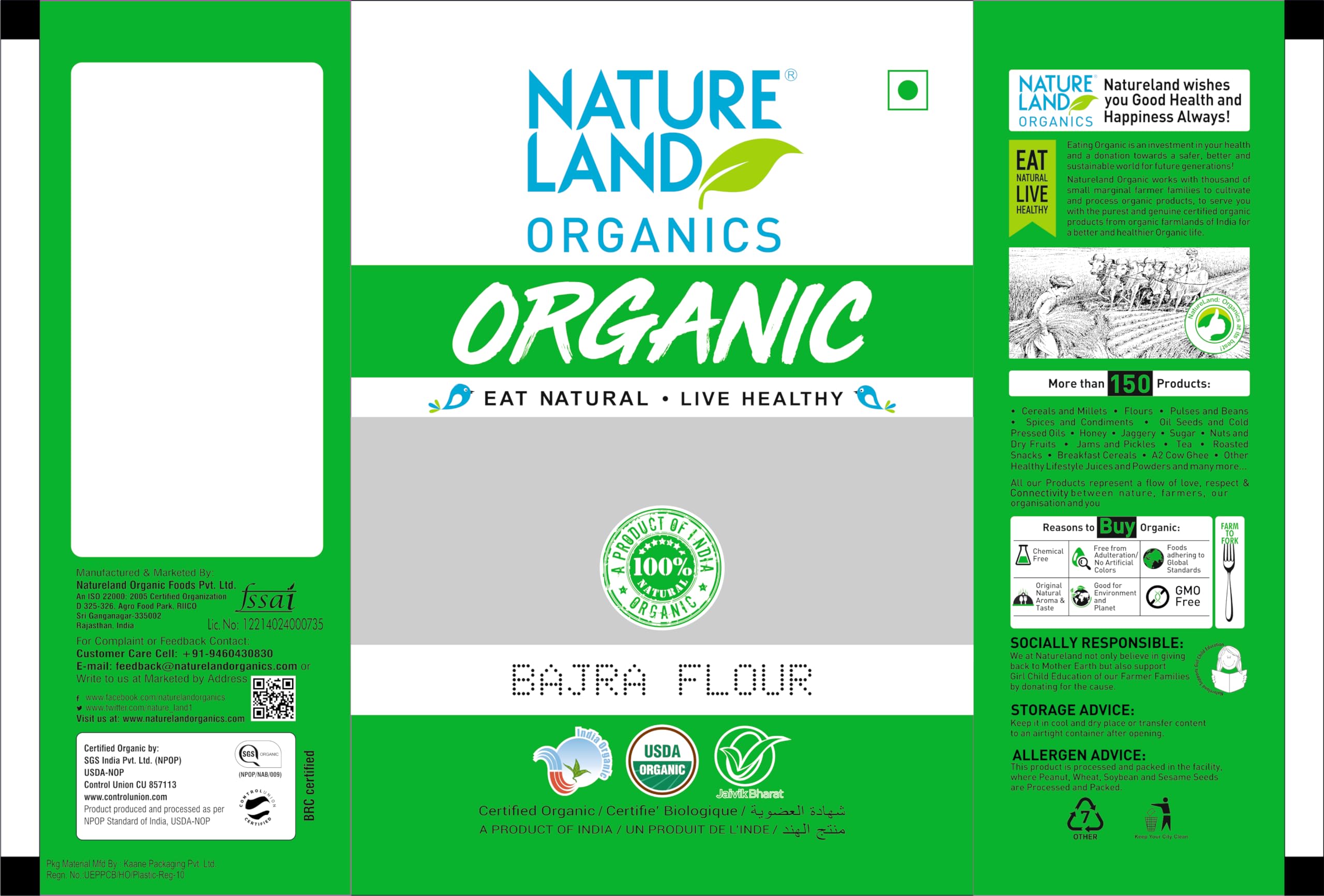Bajra is rich in insoluble fibre that aids digestion. It also reduces secretion of bile acids and is linked to a lowered risk of gallstone formation. Natureland Organic foods bajra flour is processed from selected grains of best quality processed and cleaned free from chaff broken immature and foreign matters wholesome and uniform in size and color free from obnoxious smell discoloration immature shriveled and all other impurities.