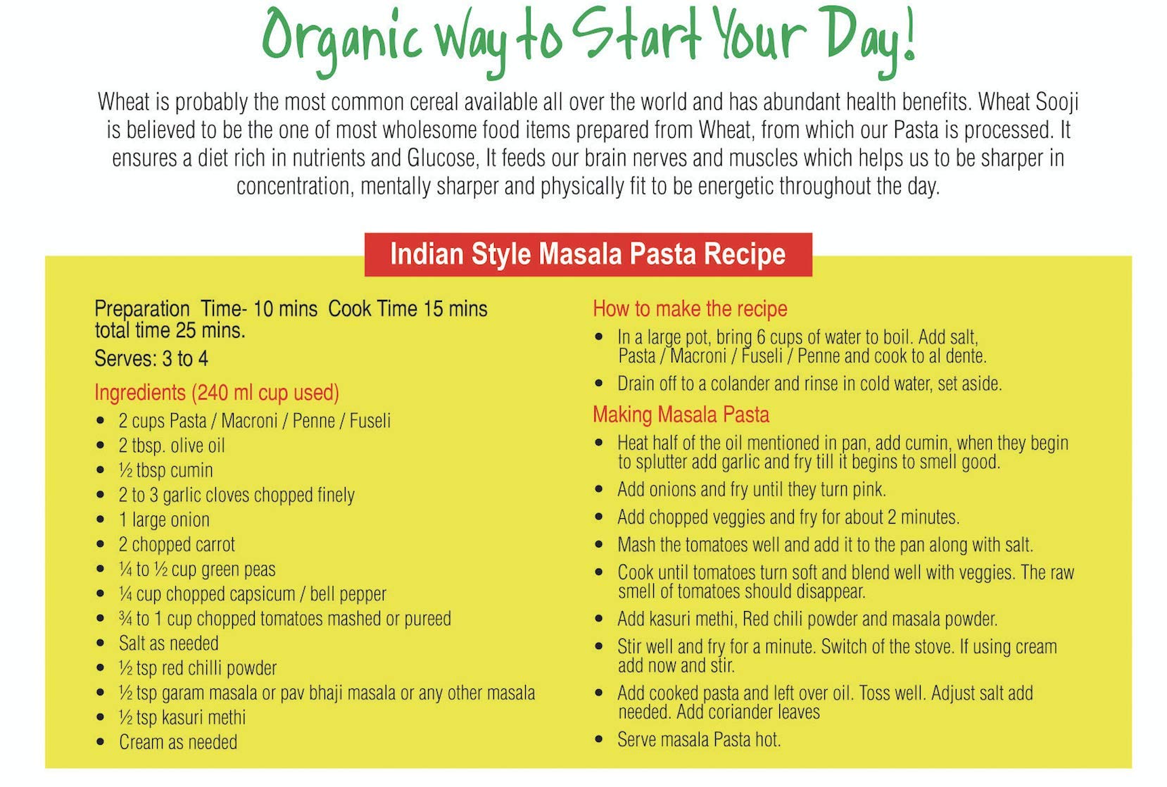 Pasta is a fat-free low sodium food that can fit right in with your weight loss plan. Pasta has a low glycaemic index (gi) so it does not cause sugar in the blood to rise quickly. Wheat is probably the most common cereal available all over the world and has abundant health benefits. Wheat sooji is believed to be one of the most wholesome food items prepared from wheat from which our pasta is processes. It ensures a diet rich in nutrients and glucose. It feeds our brain nerves and muscles which helps us to be sharper in concentration mentally sharper and physically fit to be energetic throughout the day.