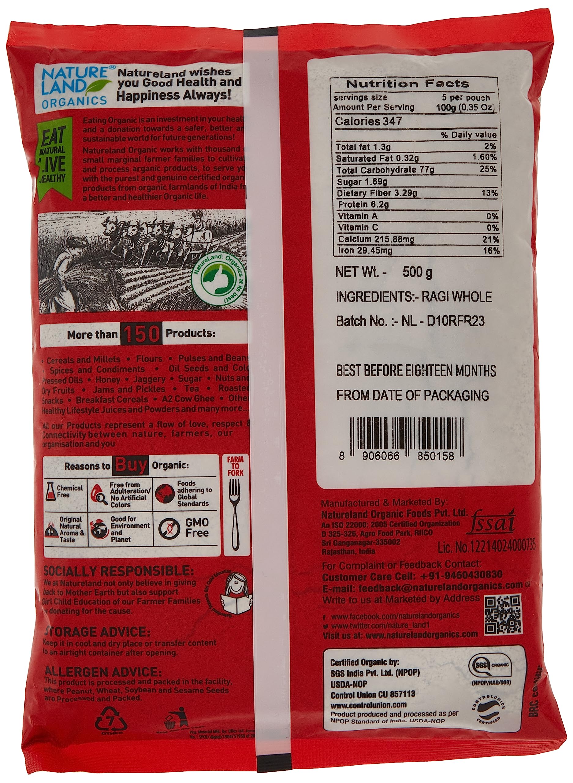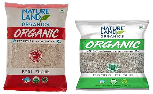 Natureland Organics Ragi Flour 500 Gm - Organic FlourRagi also has some good number of essential amino acids (eaa) which are essential for human body. Few of the key eaas which ragi has are valine methionine isoleucine threonine and tryptophan. Natureland's finger millet flour is especially valuable as it contains the amino acid methionine which is lacking in the starchy staples. Finger millet is very high in calcium rich in iron and fibre and has a better energy content than other cereals. These characteristics make it ideal for feeding to infants and the elderly.Natureland Organics Bajra/Pearl Millet Flour 500 Gm - Organic FlourBajra is rich in insoluble fibre that aids digestion. It also reduces secretion of bile acids and is linked to a lowered risk of gallstone formation. Natureland Organic foods bajra flour is processed from selected grains of best quality processed and cleaned free from chaff broken immature and foreign matters wholesome and uniform in size and color free from obnoxious smell discoloration immature shriveled and all other impurities.