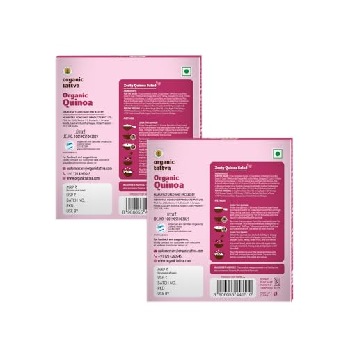 Organic Tattva Organic Quinoa is gluten free and high in protein Fiber Iron Omega 3 and other essential nutrients and Antioxidants. It's one of the few plant foods that contain al nine essential Amino Acids the reason which it's also known as Superfood and sometimes âAstronaut Food'. Quinoa gluten-free is a superfood jammed with many nutrients. It can be replaced in place of white rice for people who are on a strict diet. It is an ancient food comprising of all essential nutrients and is healthy for any person. Organic Tattva Quinoa is naturally gluten-free composed of a mixture of vitamins minerals and nutrients required by the body for carrying out the overall functioning of the human body. These are small White Quinoa Seeds that are power-packed with protein and is a fantastic wheat-free alternative providing all the nine essential amino acids. Organic Tattva Quinoa seeds per scoop provides enough nutrients to your body which satisfies your hunger and curb food cravings all day long. It is a complete vegetarian protein our quinoa provides a complete range of 9 essential and non-essential amino acids helping to maintain lean muscle mass and support enzyme production for everyday health. Quinoa seeds helps to improve metabolic health by maintain blood sugar insulin and triglyceride levels. Quinoa is tasty and known to go well with many foods Quinoa is a very convenient choice for breakfast (as a cereal) lunch (as a salad) or dinner (as a side). Switch to Organic Quinoa by Organic Tattva for a healthier you.