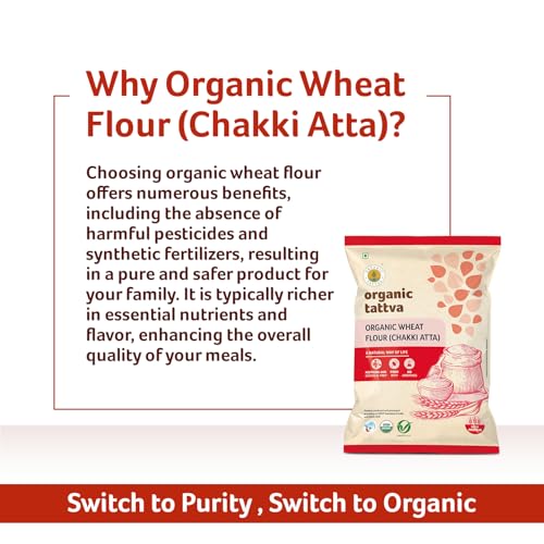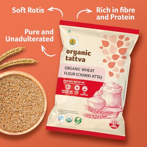 Organic Tattva Organic Wheat Flour (Atta) is produced from whole wheat using traditional chakki procedure and in a completely hygienic environment to give you the best product possible and brings the old-world goodness of rotis into homes. Organic Tattva's Organic Whole Wheat Flour atta is loaded with iron calcium and protein. Besides these nutrients Organic Whole Wheat Flour likewise contains dietary fibres sodium and the wide range of various nutrients that are needed for your body. A 100g serving of Organic Whole Wheat Flour contains 0g trans-fat and 0mg cholesterol. The calorie count per serving of Organic Whole Wheat Flour is 366.86. Its promising wholesome flavor aroma and taste will take you on healthy and tasty journey to bliss of organic food. Relish the taste and experience the 3 fingers delicateness / softness of rotis with all Organic and 100% Whole wheat Atta. Organic Tattva has a range of certified organic food products originated from our aim of providing complete solutions across organic supply chain. By offering end consumers quality organic food products which are sourced directly from farmers we make sure our involvement in the supply chain from farm to hands. Our products guarantee purity and reach your hands without the use of chemical fertilizers additives or artificial ingredients. If leading a healthy life is your mantra then switch to Organic Whole Wheat Flour by Organic Tattva today!