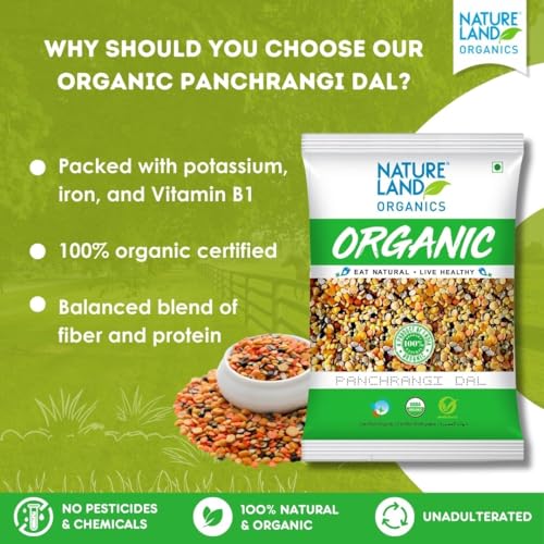Natureland's mix dal is mixture of five nutritious pulses i. E. Arhar dal chana dal masoor dal moong split chilka and urad dal chilka all these pulses are mixed in a ratio to deliver you a balance of fibre and protein while not compromising with the unmatched taste all the pulses are machine cleaned and handpicked before mixing and packing to ensure its purity and hygiene which is healthier tastier and cooks uniformly.