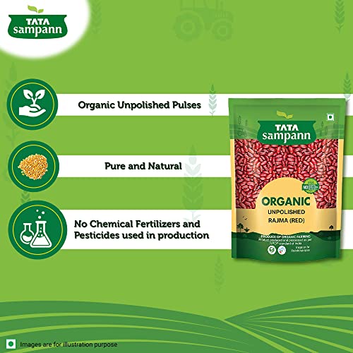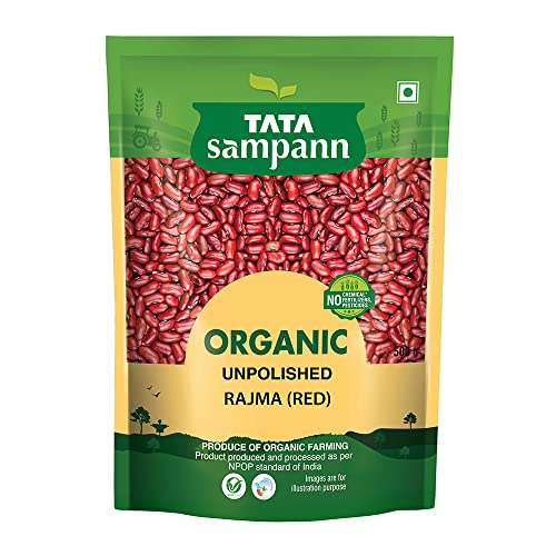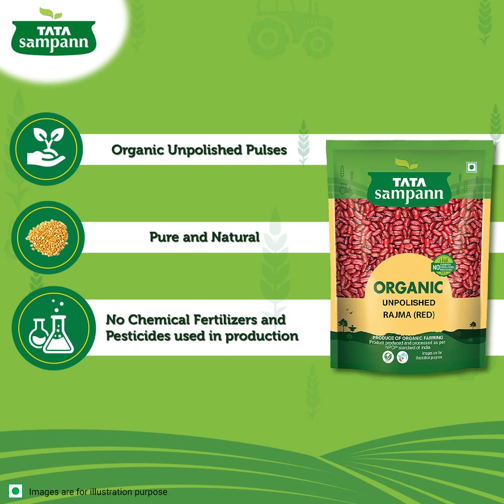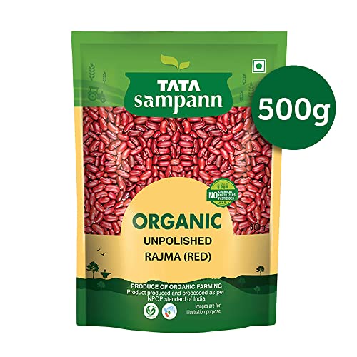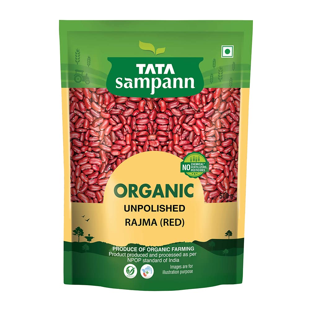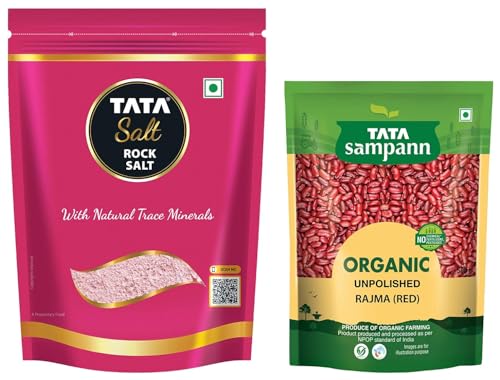 Tata Sampann Organic Rajma (Red) 500 gORGANIC : Tata Sampann Organic Pulses are sourced from certified organic farms where no chemical fertilizers or pesticides are used. PRODUCE OF ORGANIC FARMING : Tata Sampann Organic Pulses are produced and processed as per NPOP standard of India and USDA NOP UNPOLISHED : It does not undergo any artificial polishing with water oil or leather thereby retaining its goodness and wholesomeness. STRINGENT QUALITY CHECK : Ensures that the grains of dal are uniform in size and colour. So whenever you are in the mood to cook something easy and delicious dive into the scrumptious taste of Tata Sampann pulses and enjoy a delicious meal! Explore Tata Sampann Organic Pulses range â Toor Dal Masoor Dal Chana Dal Urad Whole Chana Dal Moong Dal Urad Dal Moong Dal Rajma (Red) Brown Chana Moong Chilka and Kabuli Chana.Tata Salt Rock Salt | Premium Sendha Namak | with Natural Trace Minerals | 1kg PouchTata Salt Rock Salt is sourced directly from mountains and hence it is intact with natural minerals such as calcium magnesium and potassium. This salt adds a fresh flavour burst to your everyday meals meals for special occasions and can also be used to enhance fasting foods. The packaging of sendhanamak salt keeps its freshness intact for longer. Now indulge in your favourite dishes with fresh flavours and natural minerals of Tata Rock Salt.