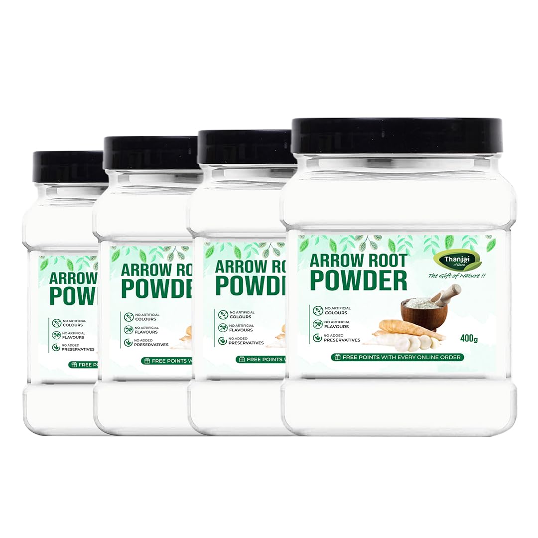 Thanjai Natural 1600g Pure and Raw Arrowroot Powder for Gravy Puddings Soups Bread and More | Natural Arrow root Powder/Flour for Babies (400G X 4 Jar)