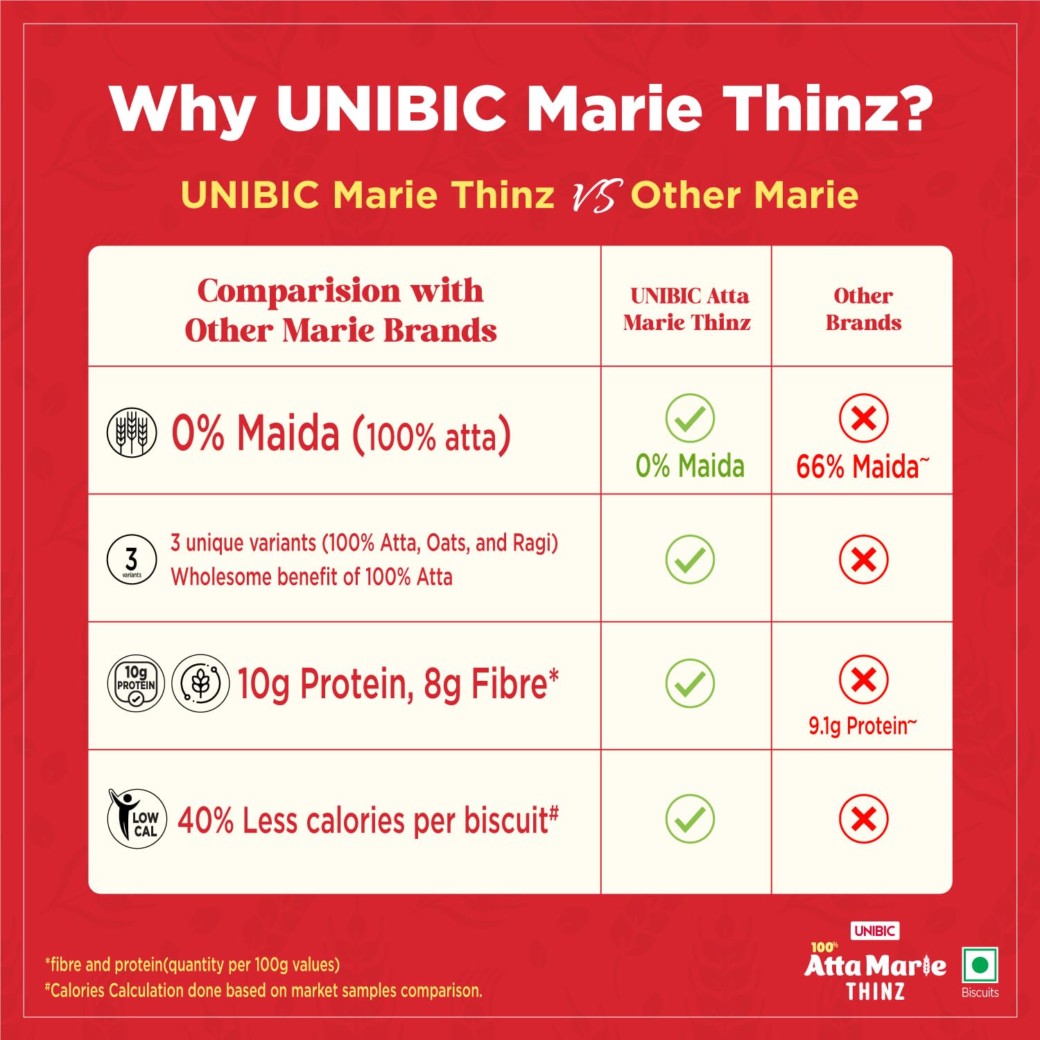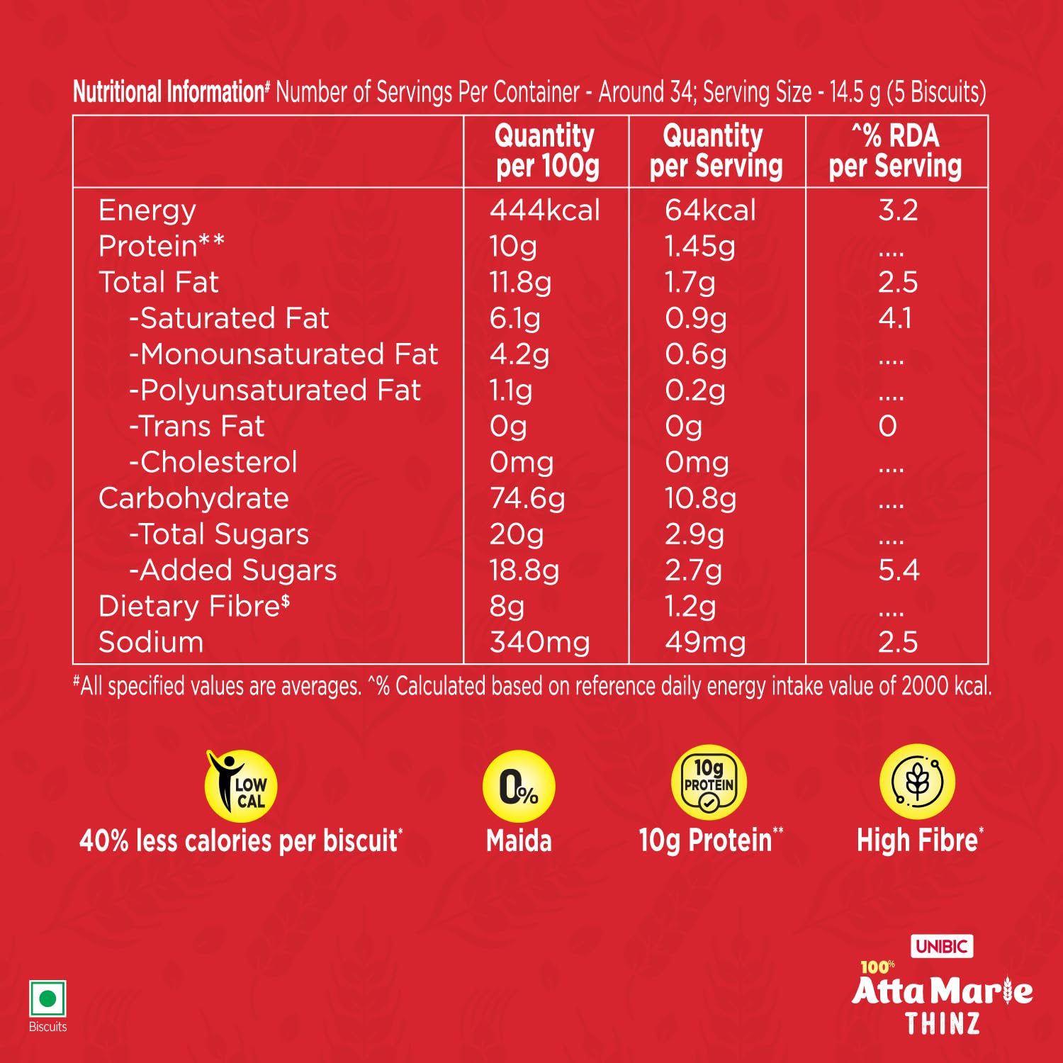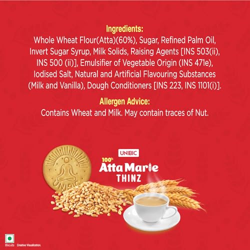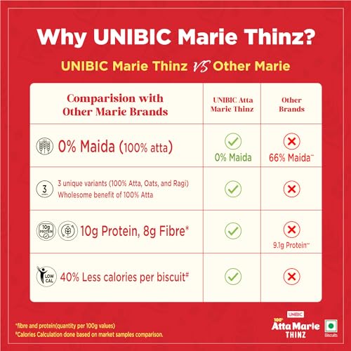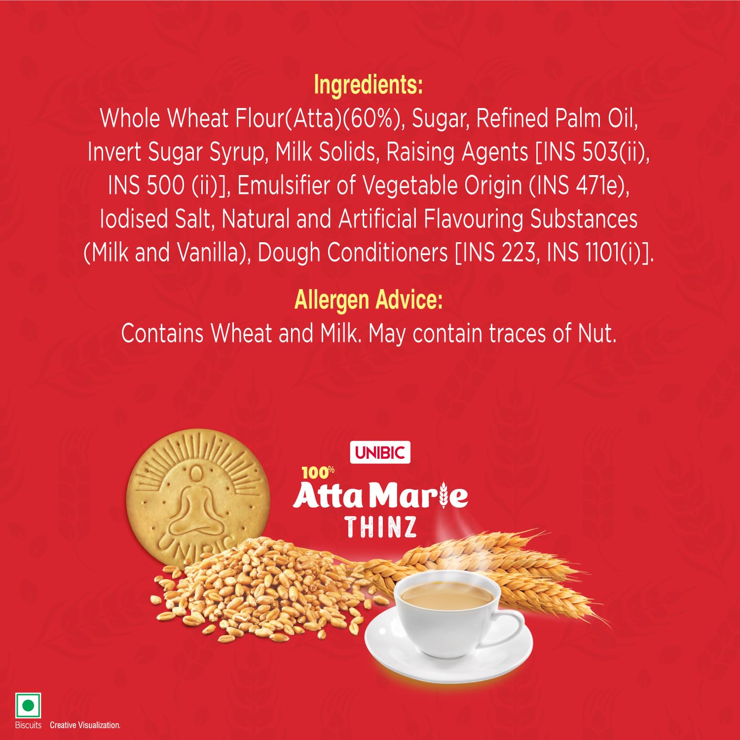 1. Embark on a journey of delicate indulgence with Unibic Marie Thinz - 100% Atta 2. Versatile and light Unibic Marie Thinz - 100% Atta are perfect as a light snack a complement to your morning or afternoon tea or a delicate base for your favourite desser