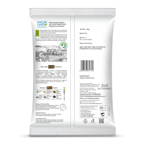 Natureland's white peas are also known as vatana in some parts of India mainly grown and harvested from north India and some parts of west India. White peas are machine cleaned and handpicked before packing to ensure its purity and hygiene which is healthier tastier and cooks uniformly.