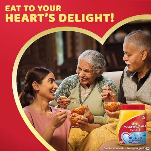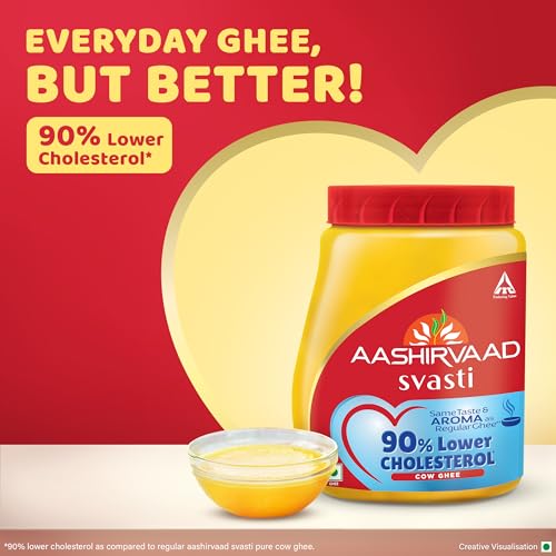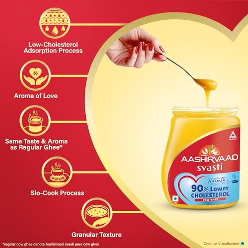 Aashirvaad the brand that you trust and love always ensures that only the best quality products reach your kitchen and Aashirvaad Svasti 90% Lower Cholesterol Ghee stays true to that. Aashirvaad ghee not only has the same rich taste and aroma as the regular cow ghee but also helps manage cholesterol. It undergoes a special Low-Cholesterol Absorption process. Aashirvaad Svasti 90% Lower Cholesterol Ghee is made with a special SloCook process similar to the process of making ghee at home. In this process the ghee is prepared by cooking slowly for about three and a half hours over gradually increased temperatures which enhances its natural aroma. Enjoy this cow ghee which has a rich aroma golden granular texture and consistent quality. Aashirvaad Svasti Pure Cow Ghee not only complements your cooking but also adds a tempting aroma to your dishes. Now add a spoonful of deliciousness guilt-free with Aashirvaad Svasti 90% Lower Cholesterol Pure Cow Ghee.