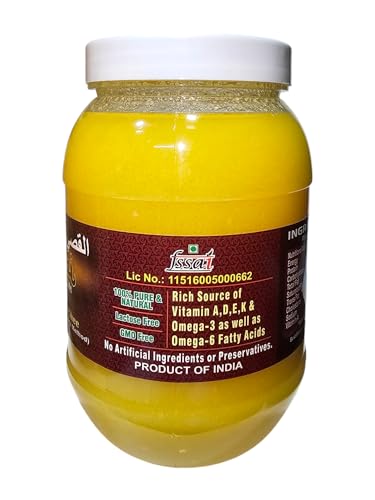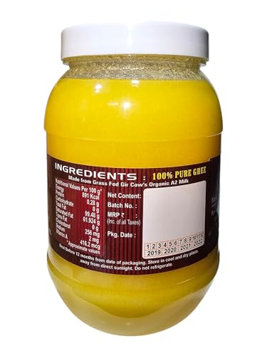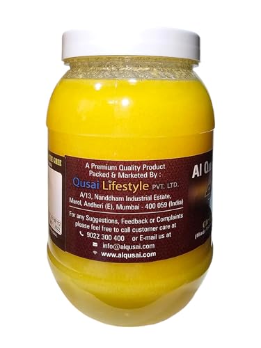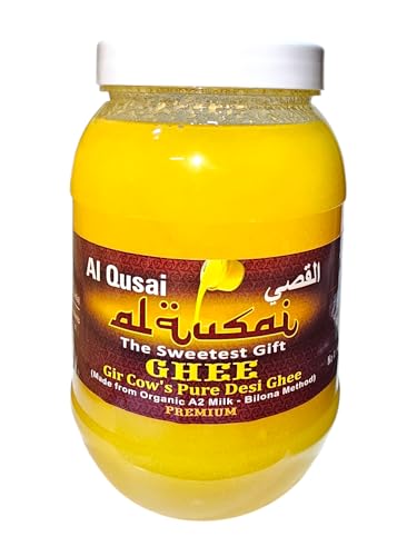 Al Qusai Gir Cow's Pure Desi Ghee (A2 Milk-Bilona Method) Traditional Pure and Nutrient-Rich Ghee for Cooking Health and Wellness Al Qusai Gir Cow's Pure Desi Ghee made from A2 milk using the traditional Bilona method is the perfect addition to your pantry. This premium-quality ghee packed in a 1-litre Pet bottle is rich in essential nutrients and is a natural healthy choice for cooking baking and supporting overall health. Known for its unique flavor and health benefits this ghee is derived from the milk of Gir cows which are known to produce A2 milk—widely appreciated for its nutritional value. Whether you use it in your cooking skincare or wellness routine Al Qusai Gir Cow's Pure Desi Ghee brings multiple benefits to your everyday life. Benefits:Supports Digestive Health: Al Qusai Gir Cow's Desi Ghee made using the Bilona method contains butyrate a fatty acid that aids digestion and supports gut health. Regular consumption can help with better nutrient absorption and improved digestion.Boosts Immune System: Packed with essential vitamins like A D E and K this ghee supports a healthy immune system. These vitamins help the body fight off common illnesses keeping you strong and healthy year-round.Promotes Healthy Skin: Ghee is known for its skin-nourishing properties. Al Qusai Gir Cow's Desi Ghee can be applied topically to hydrate dry skin improve texture and reduce skin irritations leaving your skin soft and glowing.Provides Sustained Energy: The natural fats in Al Qusai Desi Ghee offer a steady source of energy throughout the day. Unlike other fats these healthy fats are easily absorbed by the body and provide long-lasting energy without the crashes associated with refined sugar.Usage:For Cooking and Baking: Al Qusai Desi Ghee is a versatile ingredient for your kitchen. Use it for sautéing frying or baking to enhance the flavor of your dishes. It’s a great alternative to other cooking oils providing richer taste and texture.In Beverages for Energy Boost: Add a spoonful of Al Qusai Gir Cow's Pure Desi Ghee to your morning tea coffee or warm milk for an energy boost and a richer smoother texture. It helps in providing steady energy to start your day right.For Skin Care: Apply a small amount of Al Qusai Ghee to your skin to moisturize and hydrate especially during dry seasons. It helps soften rough patches reduce inflammation and improve skin elasticity.For Improved Digestion: Mix a teaspoon of Al Qusai Ghee in warm water or milk before bedtime to enhance digestion. This helps with better nutrient absorption and promotes a soothing effect on the digestive system.Why Choose Al Qusai Gir Cow's Pure Desi Ghee? Al Qusai Gir Cow's Pure Desi Ghee is crafted using the traditional Bilona method from A2 milk which retains its high nutritional content. It is free from additives and preservatives ensuring a pure natural product that is perfect for cooking skin care and overall health. Sourced from Gir cows known for their rich A2 milk this ghee supports healthy digestion boosts immunity and provides long-lasting energy. With no harmful chemicals or artificial ingredients it’s a healthier alternative to other oils and ghee available in the market.