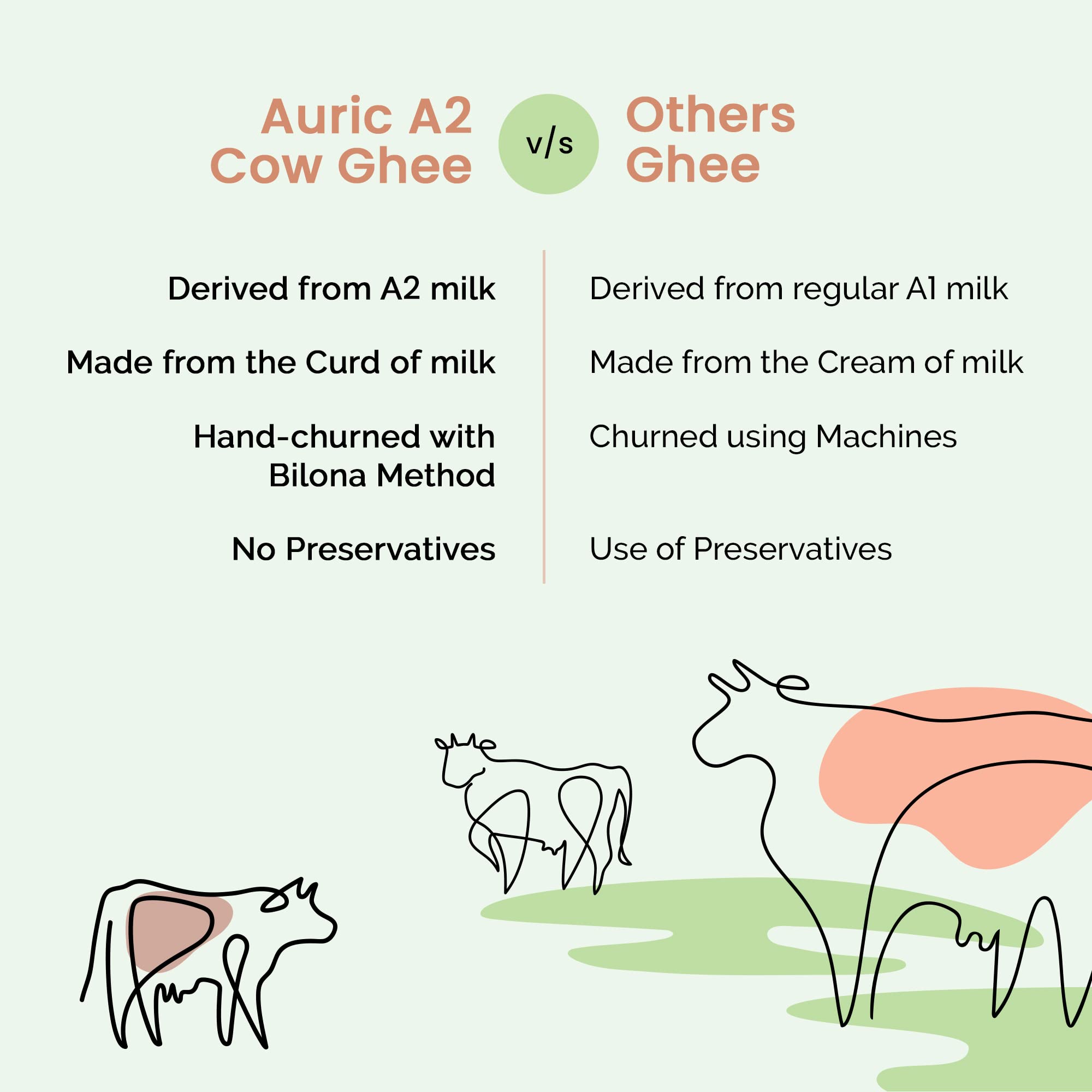 AYURVEDA INSPIRED GHEE: Desi Ghee and its Indian roots always have a story to tell. Auric A2 Cow Desi Ghee is crafted from A2 Milk of indigenous cows i.e. Gir Sahiwal & Tharparkar which are not injected with hormones using the traditional Bilona Curd Chur