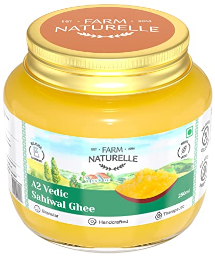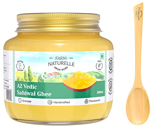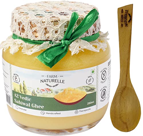 Farm Naturelle-A2 Desi Cow Ghee| Grass Fed Sahiwal Cows |Vedic Bilona method -Curd Churned - Golden, Grainy & Aromatic, Keto Friendly, NON-GMO, Lab tested - 200ml+50ml Extra With a Wooden Spoon In Glass Jar