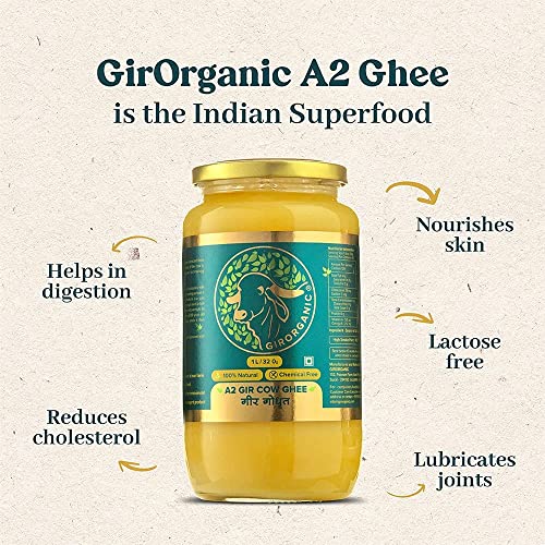 GirOrganic A2 Pure Ghee | 100% Desi Gir Cow | Vedic Bilona Method | 1 Lit Glass Bottle | Grassfed Cultured Premium & Traditional Ghee | Immunity Booster