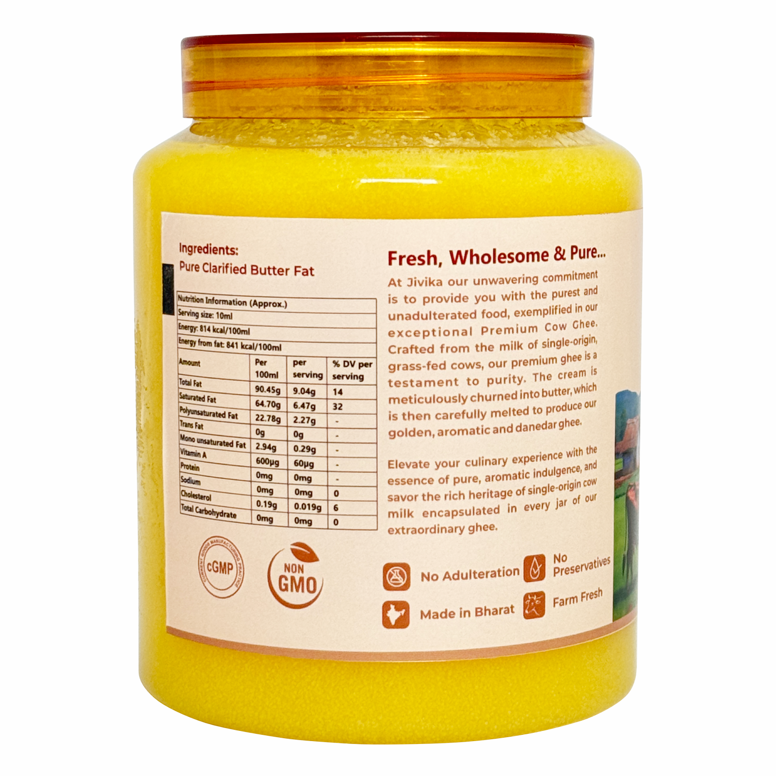 At Jivika Organics, our unwavering commitment is to provide you with the purest and unadulterated food, exemplified in our exceptional Premium Cow Ghee. Crafted from the milk of single-origin, grass-fed cows, our premium ghee is a testament to purity. The cream is meticulously churned into butter, which is then carefully melted to produce our golden, aromatic, and danedar ghee.