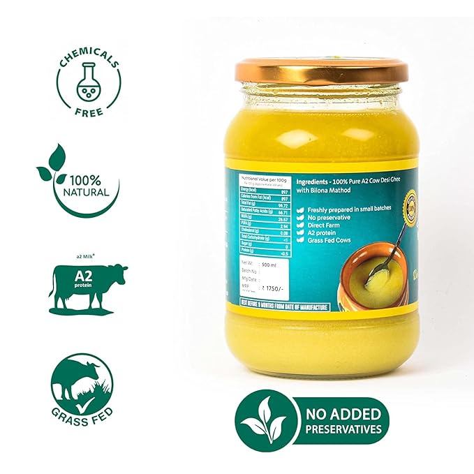 The A2- Grade Milk that is used to extract this milk ghee is known to be one of the healthiest cow milk to have ever existed. Such grade milk is found in the Gir cows and is turned into ghee using the Bilona method of churning. With the right sentiment of feeding the calves first, the milk is then collected from the cows and put to boil in earthen pots. After boiling the milk on wood and fire, it is left outside overnight for it to curdle. The curdled milk is then churned which separates the buttermilk. The bilona method ghee then generates 100% A2 Gir Cow Ghee often known as Bilona Ghee or Bilona Method Ghee.