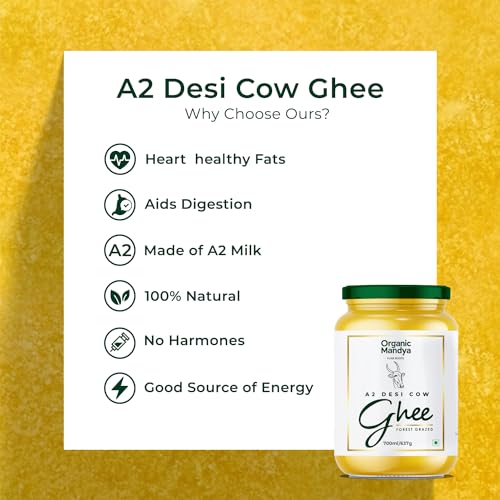 Desi A2 ghee offers several benefits due to its unique composition and traditional preparation methods. Here are some of the benefits associated with desi A2 ghee: Nutrient-rich: Desi A2 ghee is rich in essential nutrients like vitamins A D E and K. These vitamins play a vital role in supporting various bodily functions including vision bone health immune function and blood clotting. High smoke point: Desi A2 ghee has a high smoke point which means it can withstand high temperatures without breaking down or producing harmful free radicals. This makes it a suitable and stable cooking fat for various culinary purposes such as frying sautéing and baking Rich flavor: Desi A2 ghee has a distinct rich and nutty flavor that enhances the taste of food. It adds depth and richness to dishes making them more delicious Digestive aid: The butyric acid present in desi A2 ghee is known for its digestive properties. It helps stimulate the production of digestive enzymes supports a healthy gut lining and can aid in reducing inflammation in the digestive system. Supports healthy metabolism: The medium-chain fatty acids (MCFAs) found in desi A2 ghee are easily digestible and quickly converted into energy by the body. This can help support a healthy metabolism and provide a readily available source of fuel. Moisturizing and nourishing: Desi A2 ghee can be used topically as a natural moisturizer for the skin and hair. It helps hydrate the skin improves skin elasticity and provides nourishment to the hair follicles promoting healthy hair growth. It's important to note that while desi A2 ghee offers potential benefits individual results may vary. It's always advisable to consume ghee in moderation as part of a balanced diet and consult with a healthcare professional for personalized advice.
