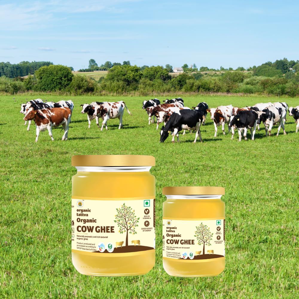 Organic Tattva Cow Ghee is produced using organic milk sourced from healthy and happy cows living in organic farms. These farms are self sufficient practising closed loop soil management system which means nothing wasted in the farms and no external dependability. The cows in the farm are allowed to freely graze the organic fodder and be in their natural habitat. Our Cow Ghee is made with conscience and care.