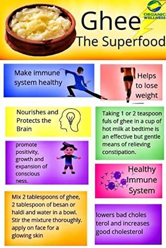 Organic wellness cow ghee is probably the only authentic desi ghee around since it is made from butter obtained by churning whole milk curd. Unlike other ghee products that are made from just milk fats it is distinctively aromatic and delicious. The purity of the milk used is attributed to cows who freely roam natural pastures and graze on fresh grass. With no gmo feeds no antibiotics no hormonal supplements in the diet the milk is not just pure but divine. Directions: add 1/2 - 1 teaspoon to your food smoothie yogurt or flour and blend well. Consume on empty stomach for 3 months or as directed by healthcare provider. Safe for long term use.