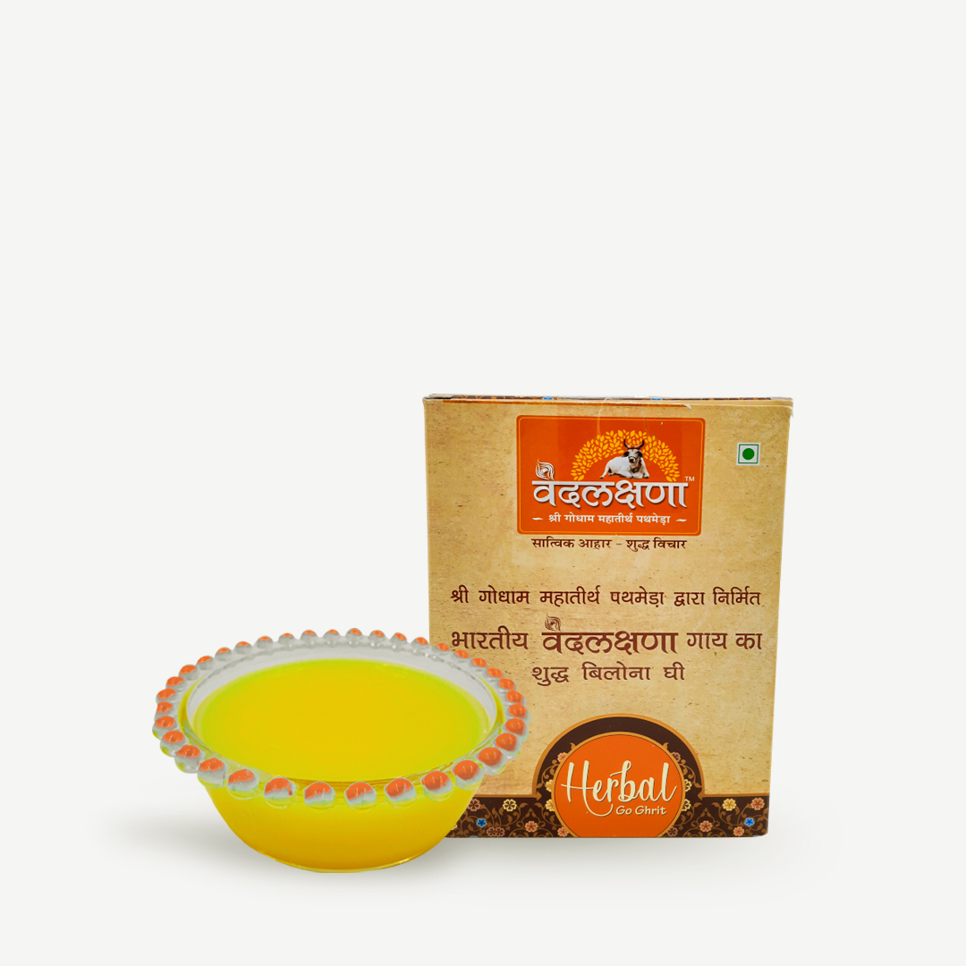 Our Desi Herbal Bilona Ghrit is made using traditional methods. Hand-picked gaushala provide fresh and pure cow milk, preserved before being converted into curd. The curd is then slowly churned clockwise & anti-clockwise to produce butter, which is subsequently heated to produce the highest quality pure cow ghee. This Vedic Herbal Ghrit contains Asparagus, Ashwagandha, Mulethi, Fenugreek, Turmeric, Ajwain, etc. thats aids in the lubrication of joints, is beneficial to ones health related to the musculoskeletal disorder, bile, and cough. The best to take is to mix it with warm milk and drink it.