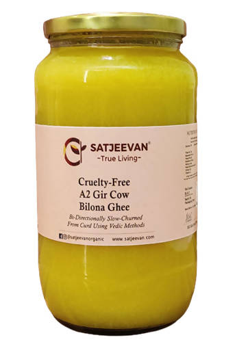 Satjeevan A2 Gir Cow Bilona GheeSatjeevan's Organic Vedic A2 Gir Cow Bilona Ghee, also known as Organic Vedic Ghee, is made from Bi-Directionally Slow-Churned Organic Curds made from Grass-Fed Pure Deshi Breed Gir Cows' Whole Raw Milk as per Ayurvedic Scriptures:Benefits:Forest-grazing Gir cows eating organic fodder and ayurvedic herbsCalves not separated from their mothersNatural pregnancies and immunityNo hormones, vaccines, surgeries, or slaughterNo pasteurization, irradiation, or homogenizationLovingly cared for by traditional cow-herd families (gopalan)Calves are given first preference over milkLegal Disclaimer: Product images are for illustrative purposes only. Images/packaging/ labels may vary from time to time due to changes made by the manufacturer's manufacturing