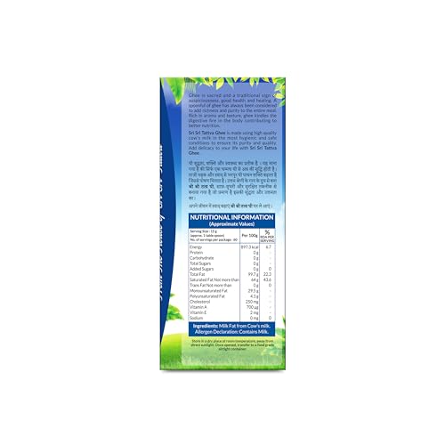 Rich in aroma and texture ghee kindles the digestive fire in the body contributing to a better nutrition. Sri Sri Products pure desi ghee is manufactured using high quality cow's milk in the most hygienic and safe conditions to ensure its purity and quality. Add delicacy to your life with sri Sri Products ghee.