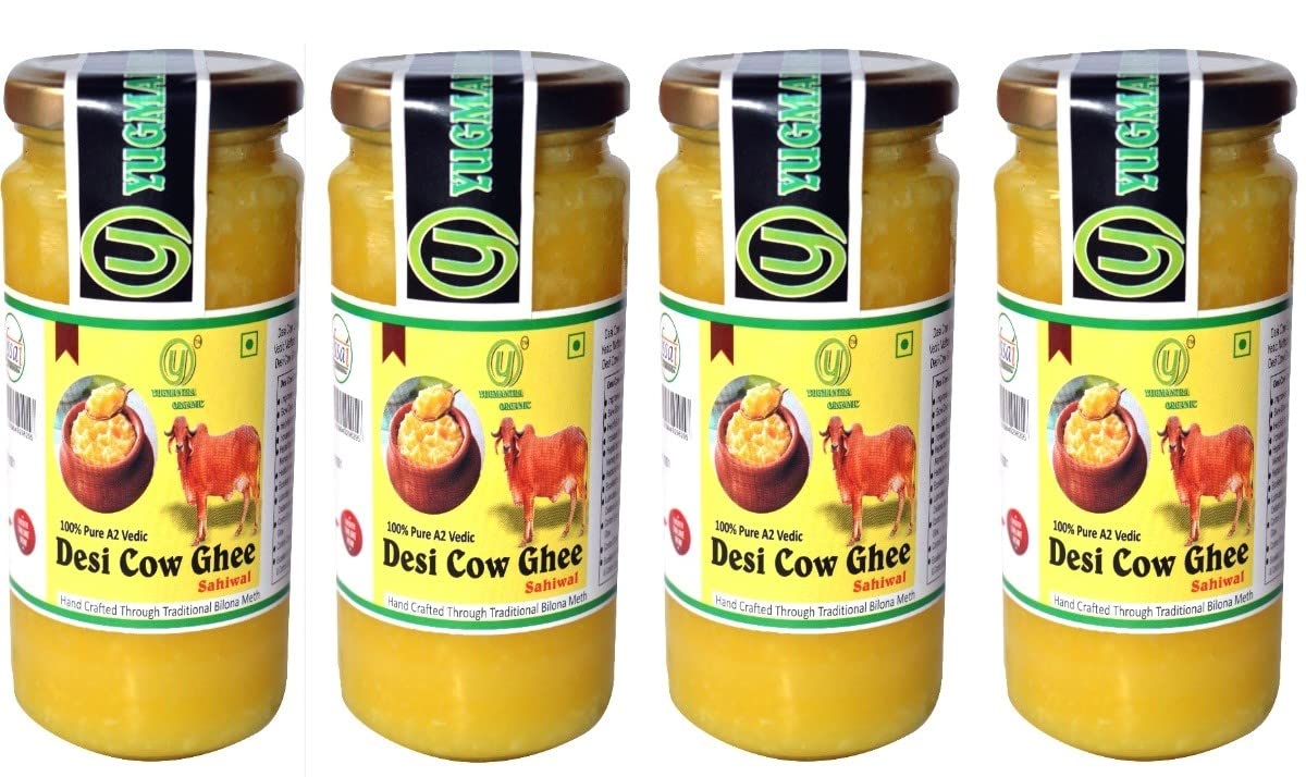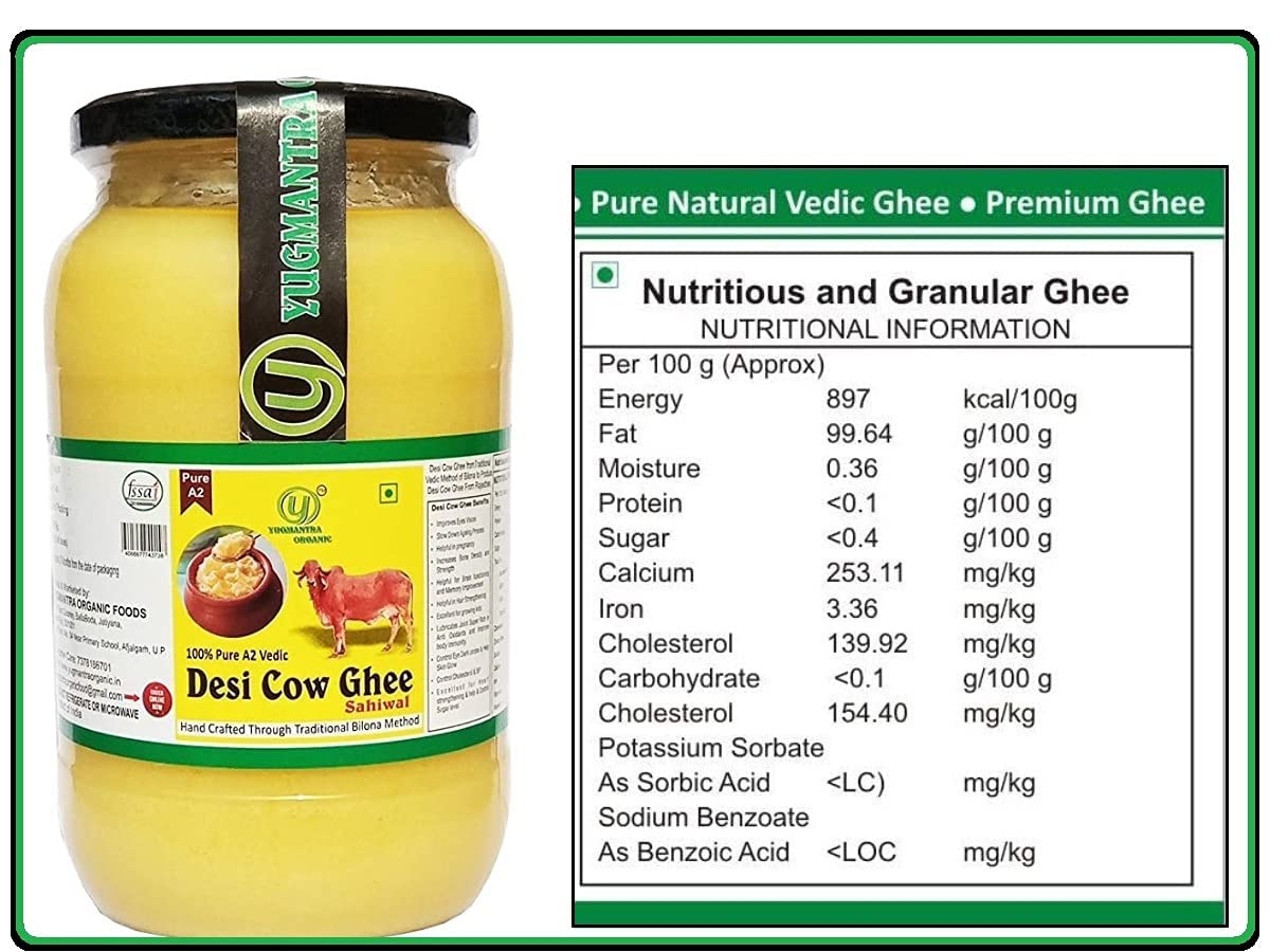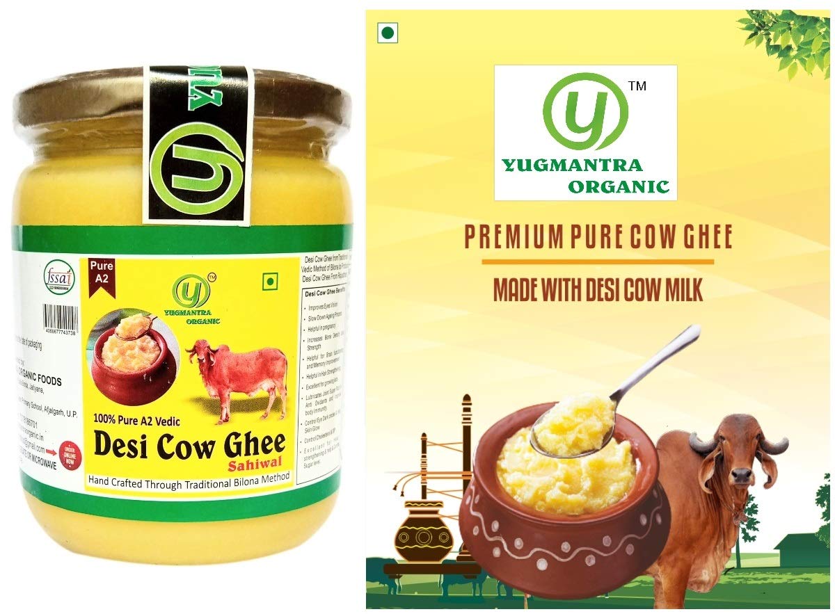 Yugmantra Organic Foods Pure Natural A2 Milk Shudh Desi Sahiwal Cow's Ghee from Alwar Traditional Vedic Method of Bilona to Produce Desi Ghee: Milk-Curd-Churn Curd in Clay Pots-Extract Butter-Heat the Butter-Granulated Yellow Cow Ghee is produced We believe it to be excellent for growing kids Power house of Vitamins that promotes good health and is super rich in anti-oxidants to improve body immunity.