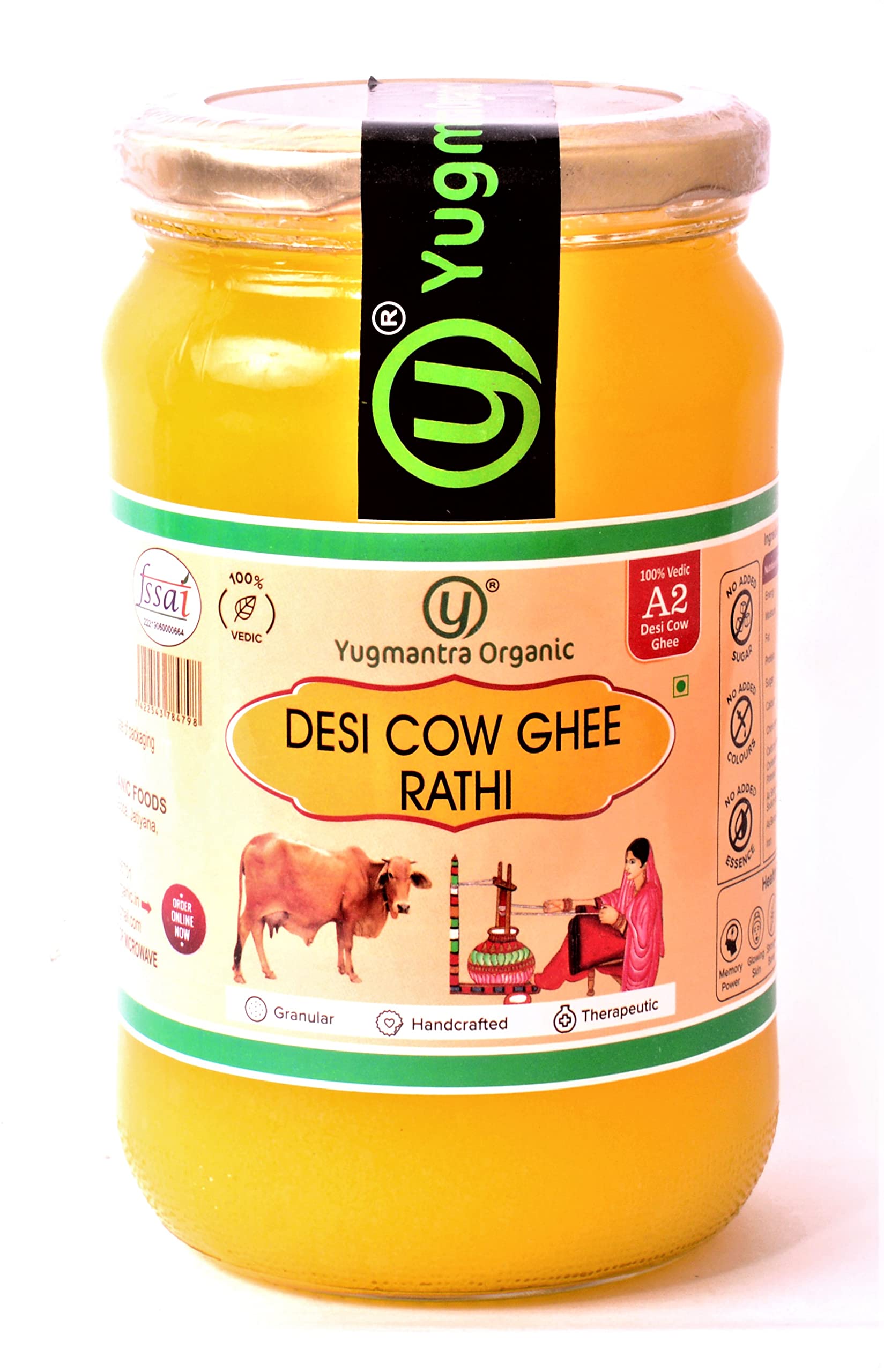 Yugmantra Organic Cow Ghee made from A2 Milk of Indian Native Cow Rathi by using old traditional Bilona method Ghee is 100% Natural and Pure free from pesticides and chemicals guaranted Traditional Method of Bilona to Produce Desi Ghee: Milk- Curd in Clay