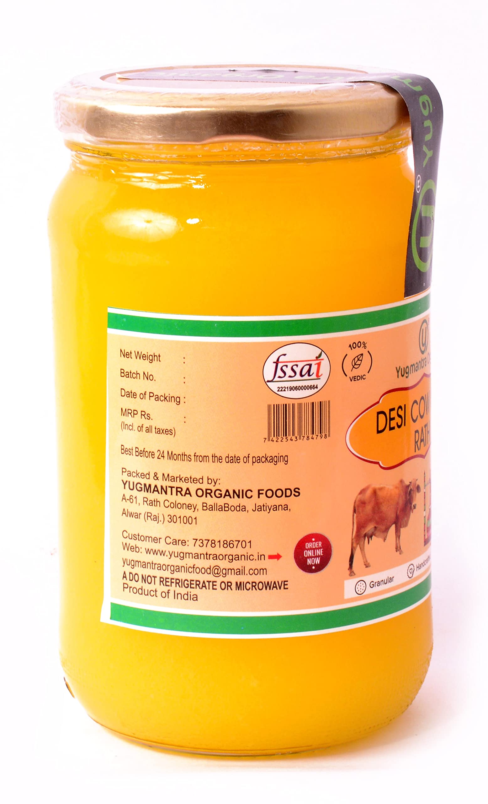 Yugmantra Organic Foods 100% Pure Natural Desi Rathi Cow Ghee - Prepared from A2 Milk Bilona Method-Immunity Superfood (650 ml Glass Bottle)