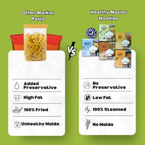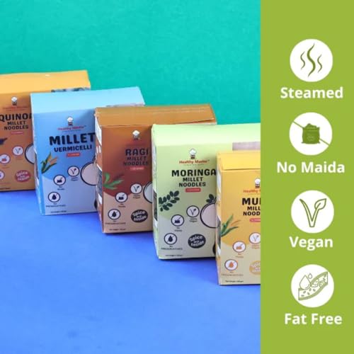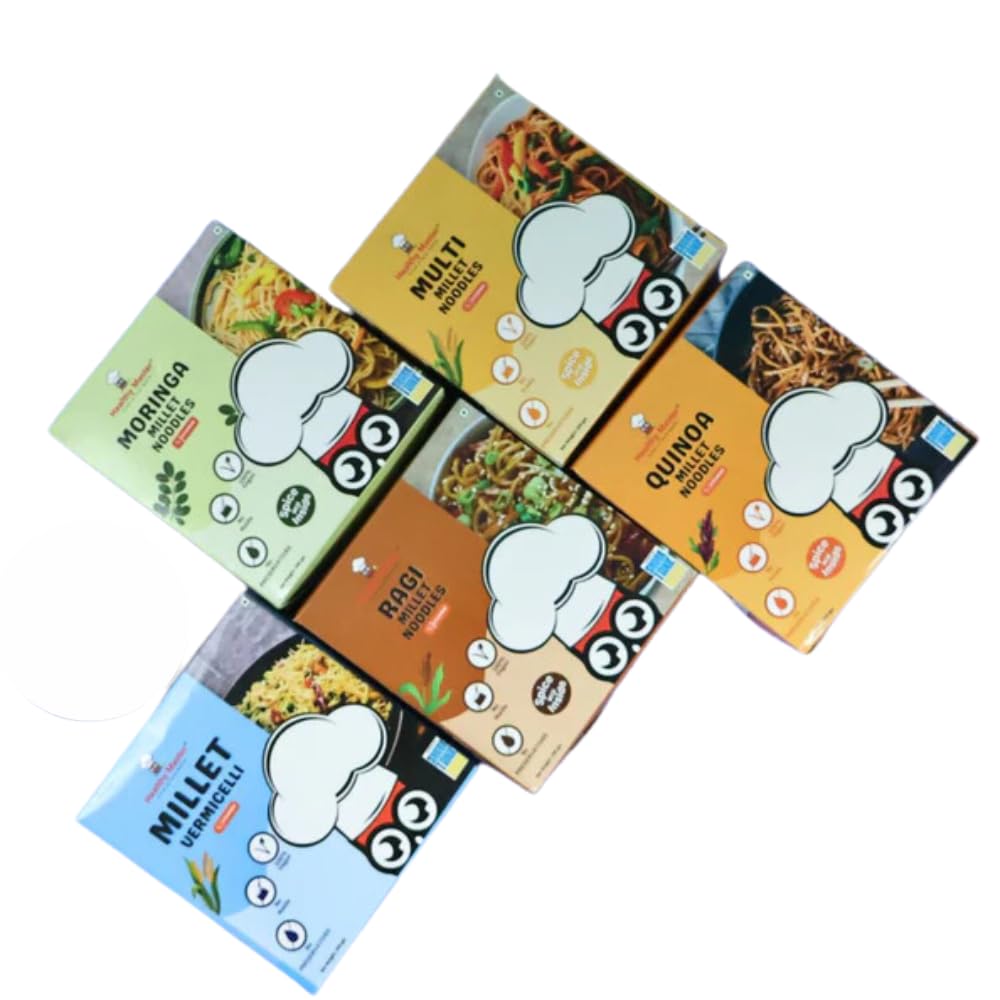 Millet Noodles are a healthy alternative that tastes delicious. These noodles not only taste good but also have many health benefits. There are many reasons why millet is gaining popularity. One of the most notable ones being it's gluten-free and actually a healthier alternative for wheat-based noodles. Millet is a functional food. It has been proven to reduce cholesterol lower blood sugar and it contains all essential amino acids. Some obvious benefits of millet are that it is gluten-free high in fiber and a good source of vitamins and minerals. It can also be an excellent alternative to wheat if you have a sensitivity to gluten or flour. Buy Millet Noodles from the healthy master.Millet vermicelli is a delicious high-fiber alternative to your everyday pasta. It can even help lower cholesterol levels and blood pressure making it a true superfood. Like other grains millet contains all of the essential amino acids and is rich in B-complex vitamins especially thiamin niacin and folic acid. Buy Millet Vermicelli Online at Best Price India from the healthy master.All our produced noodles are 100% made from non-genetically modified (non-GMO). Our vitamin-rich noodles contain no preservatives additives or colorings. Our product is suitable for people who have gluten sensitivity and also for those individuals who are health conscious. Buy online Ragi Noodles from the healthy master.
