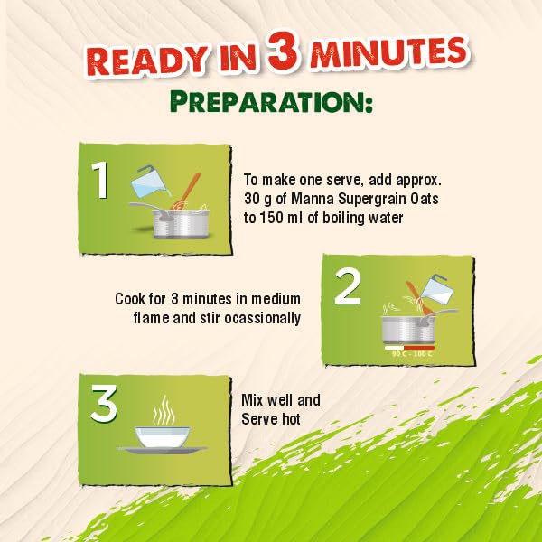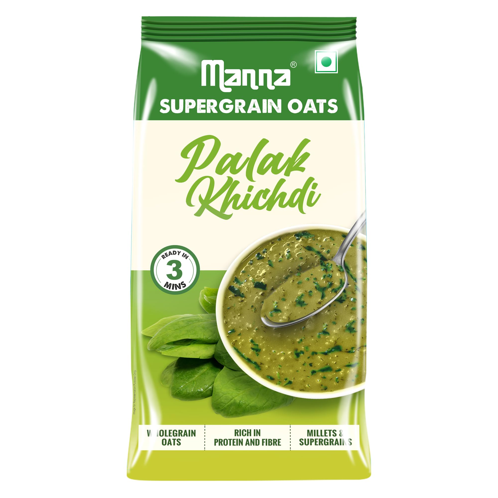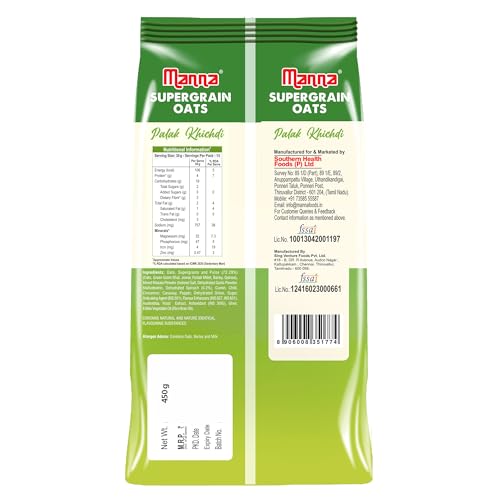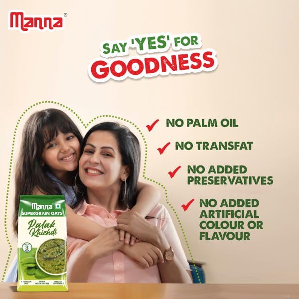 Introducing Manna Palak Khichdi Oats a nutritious blend of Oats and nutritious Spinach along with desi spices blended to bring the flavours of traditional khichdi. Enjoy a delicious healthy and quick snack ready in just 3 minutes. - No Palm Oil - No Trans Fat - No Added Artificial Colour or Flavour - No Added Preservative