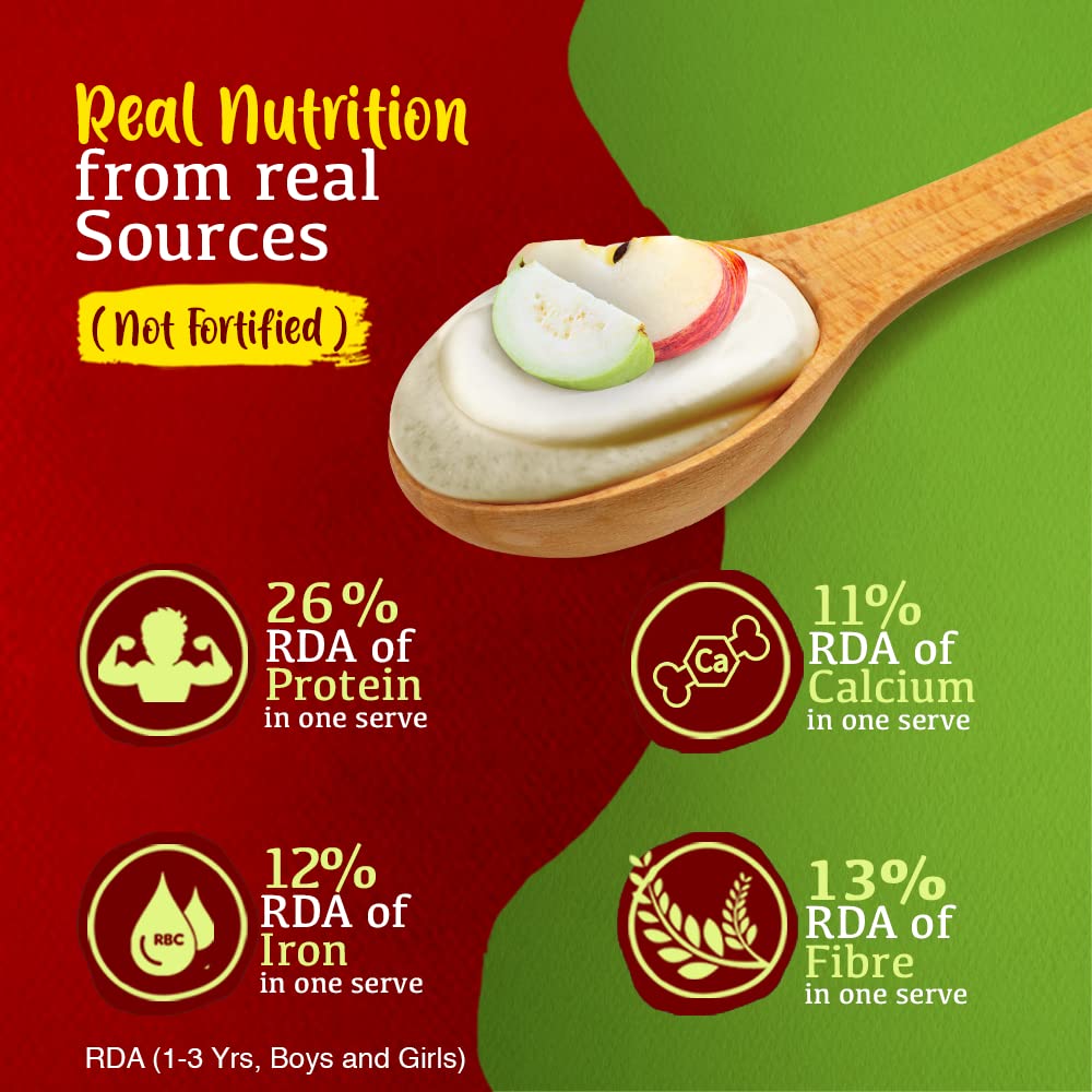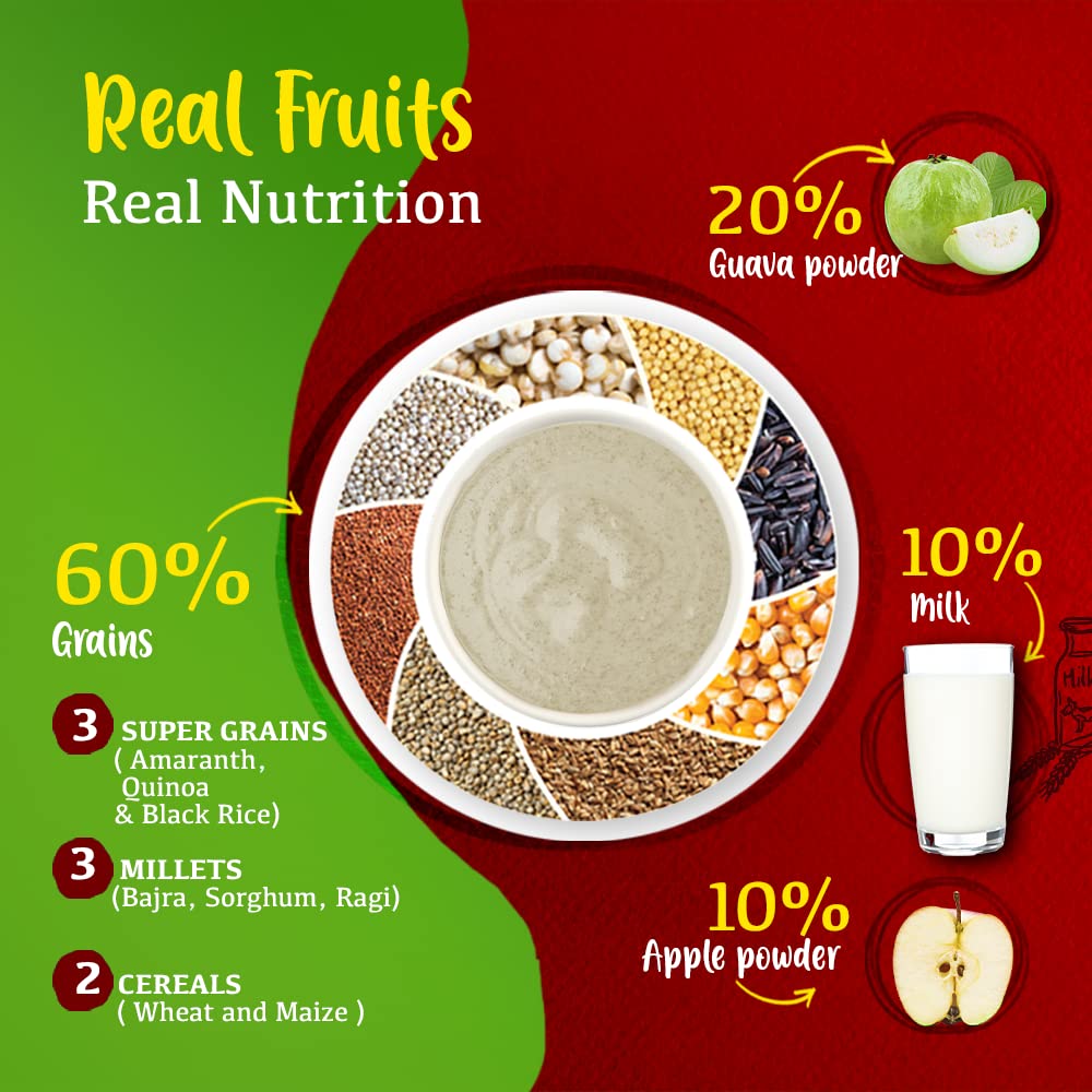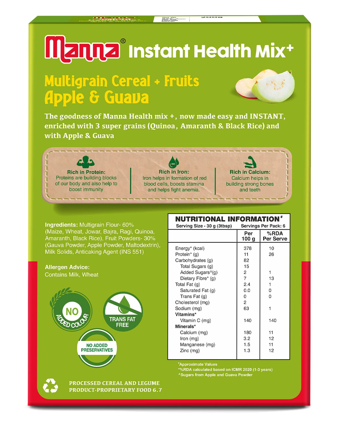 Manna Health Mix Instant Multigrain Cereal Apple & Guava with Milk. Made with Real Fruits and 8 Supergrains and Millets. No Added Sugar No Artificial Color Flavors 200g