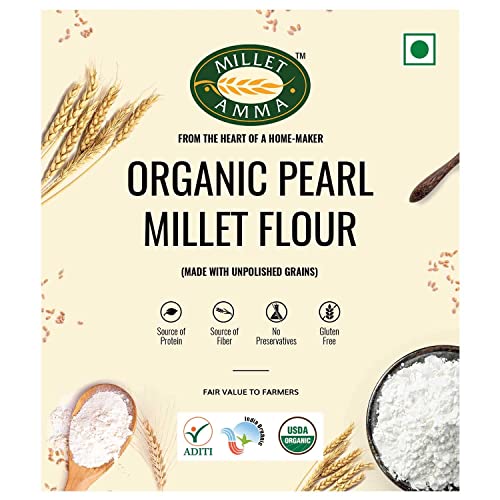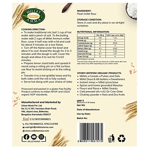 Millet Amma CERTIFIED ORGANIC Bajra (Pearl Millet) Flour | 2Kg (1kg x 2 Packs) | (Kambu, Sajje, Sajja, Bajri, Kambam) | Gluten Free, Rich in Protein | Suitable for Multiple Millet Recipes (Roti, Dosa)