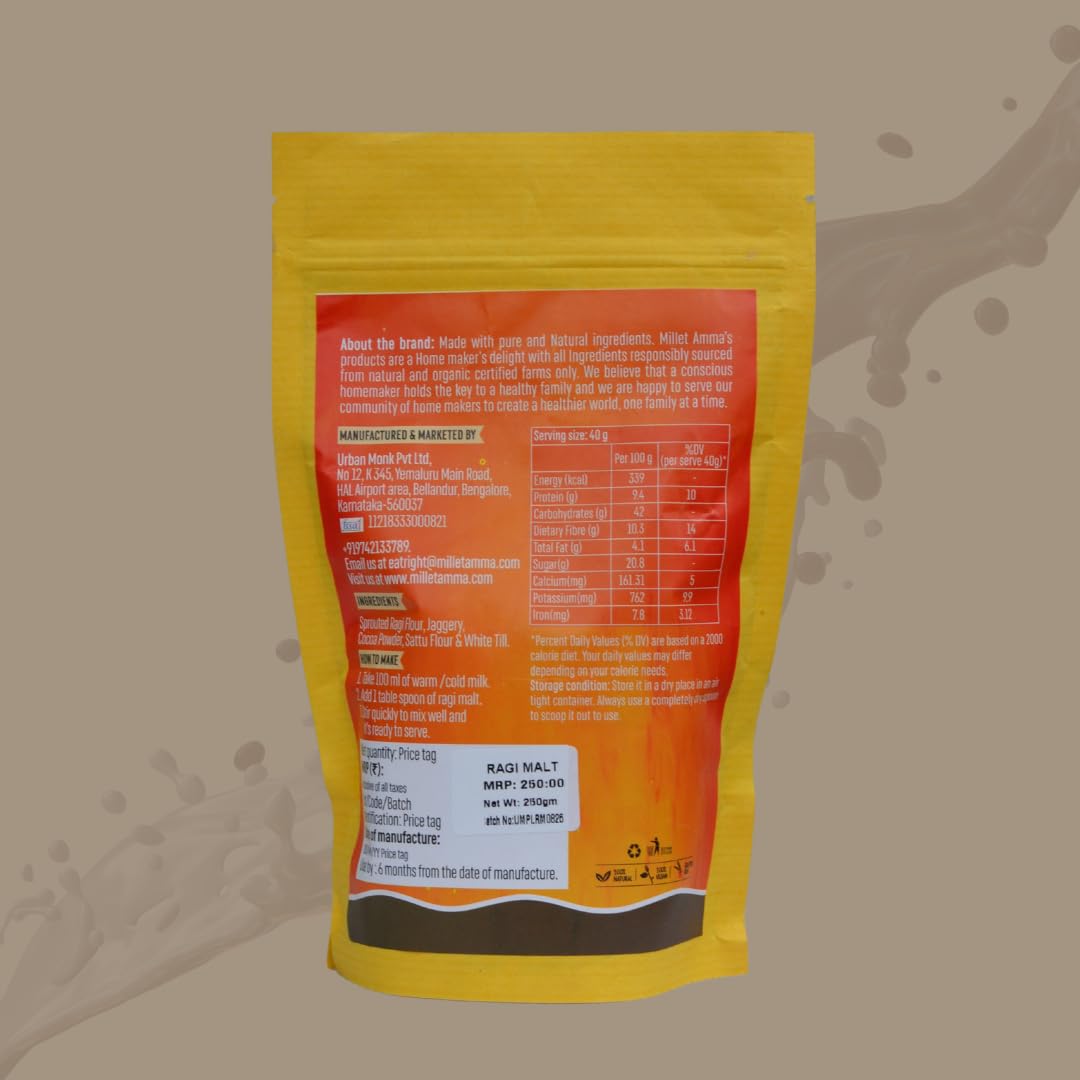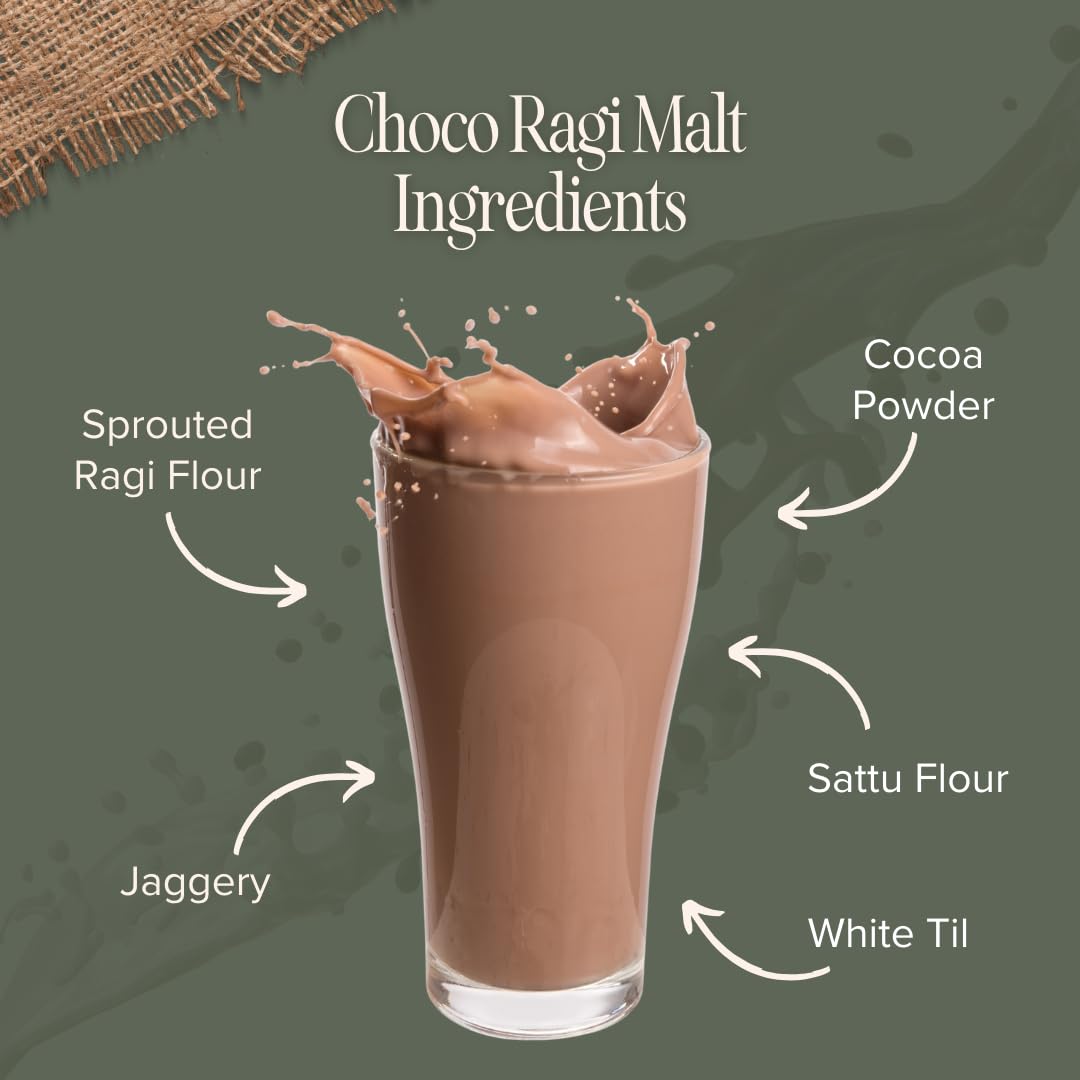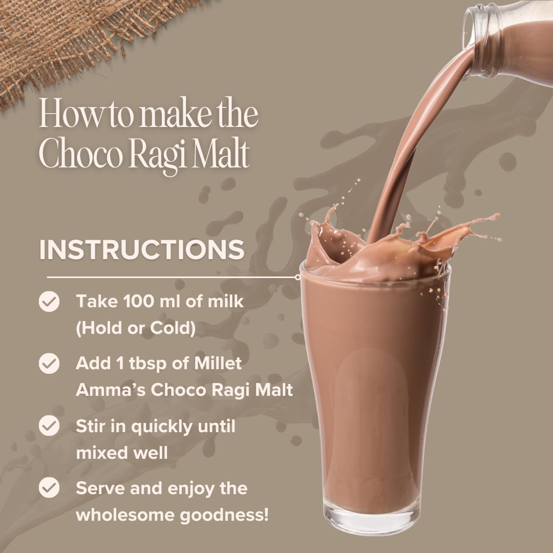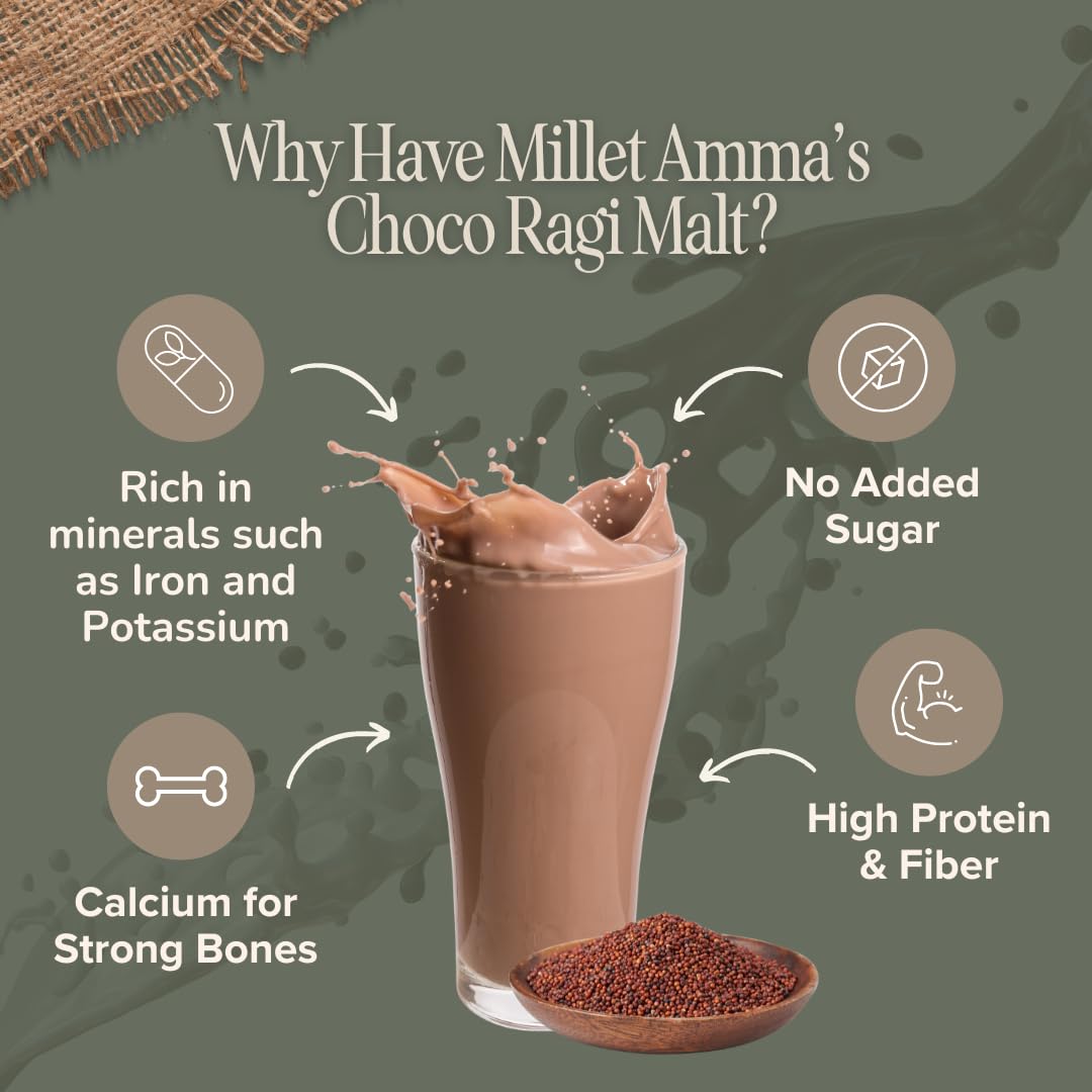 Explore our Millet Choco Ragi Malt from the house of Millet Amma available on Amazon. This instant millet protein mix is made of sprouted ragi flour sattu flour jaggery cocoa powder and white til offering you a vegan gluten free and nutrient packed drink. Our Millet Choco Ragi Malt is perfect for anyone looking to add a healthy twist to their daily routine. With 40% millet content this delightful mix is loaded with protein fiber and essential minerals like calcium and iron making it an ideal choice for both kids and adults.Serving Recommendation: Simply stir 1 tablespoon of Choco Ragi Malt into 100ml of hot or cold milk (or water) for a quick nourishing drink. Enjoy it as a healthy alternative to chocolate milk or protein shakes. Whether you're seeking a quick energy boost a fiber rich snack or a calcium fortified drink Millet Choco Ragi Malt is the perfect choice to support your healthy lifestyle.