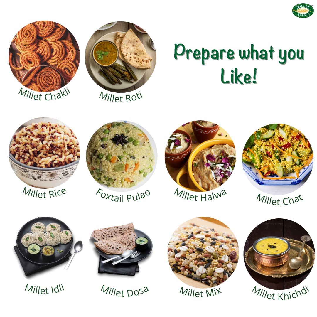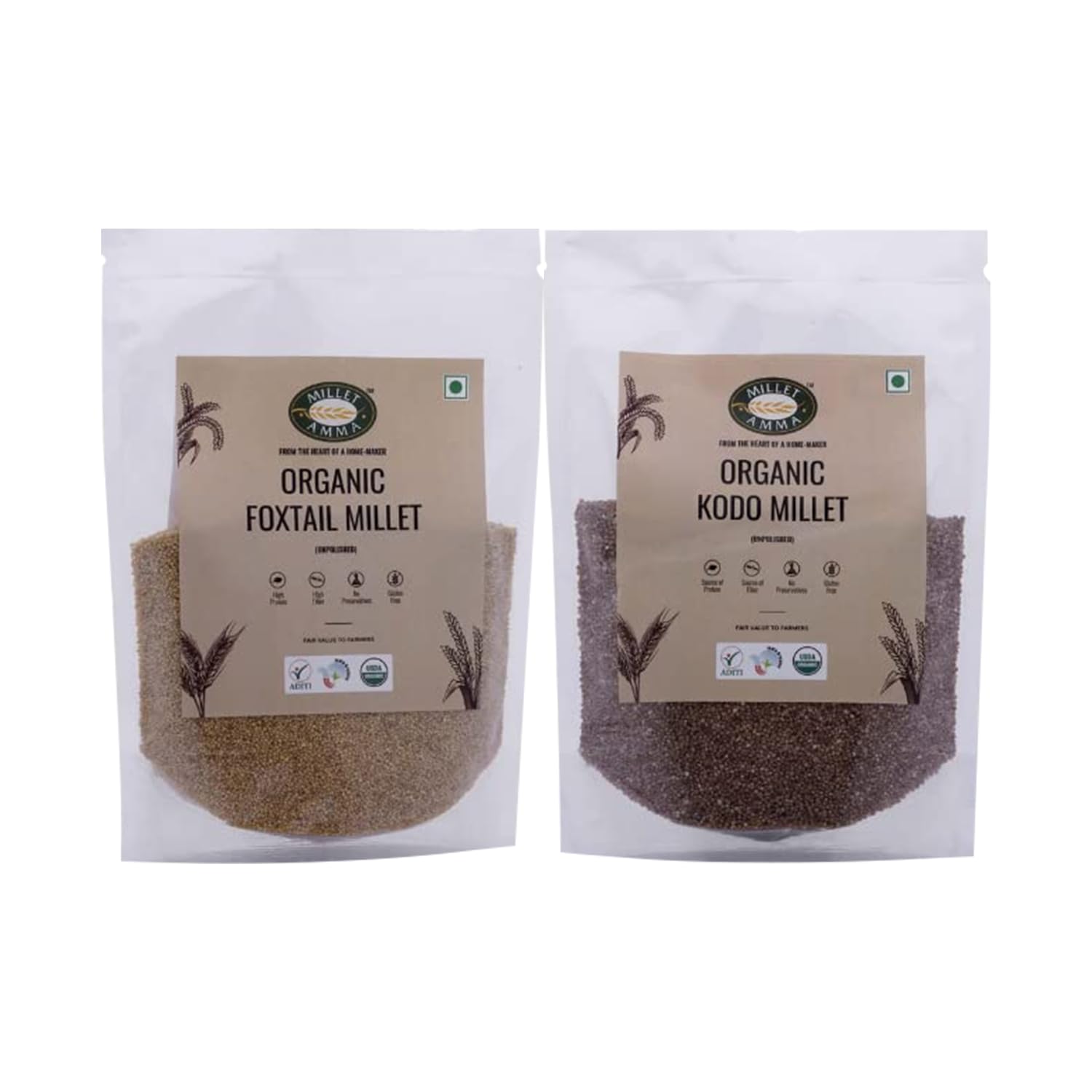 Shop wide rang of Millets from the house of MILLET AMMA available on Amazon. Certified Organic Foxtail and Kodo Millet is a nutrient packed gluten free superfood that offers a wide range of health benefits while being versatile enough to suit any meal plan. our Foxtail and Kodo Millet is a wholesome choice for those seeking a natural and pure source of nutrition. Rich in essential nutrients like protein fiber iron and B vitamins Foxtail and Kodo Millet is perfect for maintaining overall wellness. With its low glycemic index it,s an ideal choice for individuals looking to manage their blood sugar levels making it especially suitable for diabetics. High in dietary fiber it aids digestion and helps keep you fuller for longer supporting weight management and a healthy gut.