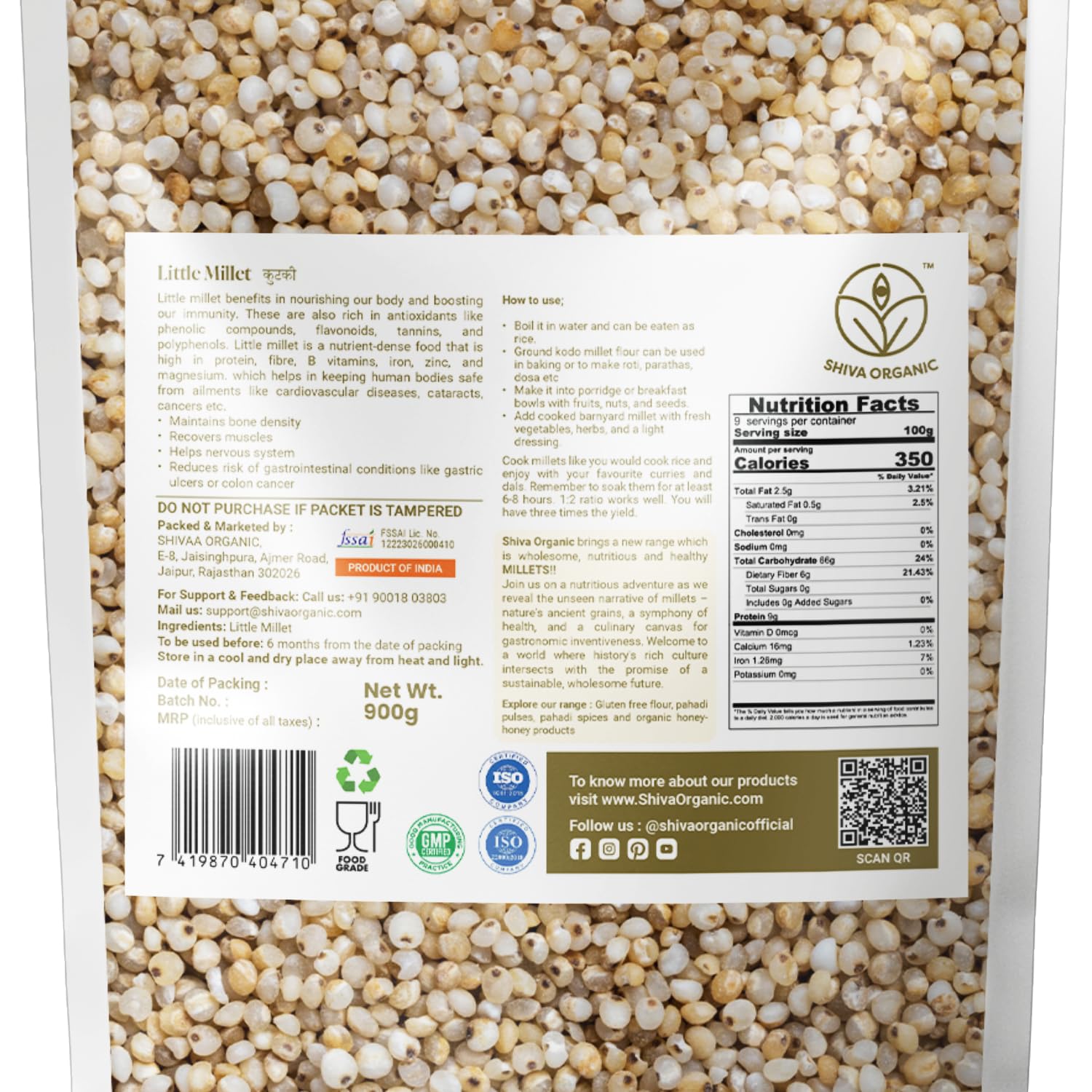 Shiva Organic Unpolished Little Millet -900 g | High Protein Gluten Free | Low Calories Low GI | Sourced organically