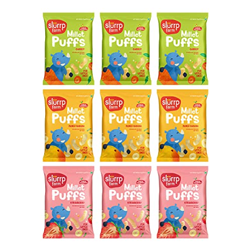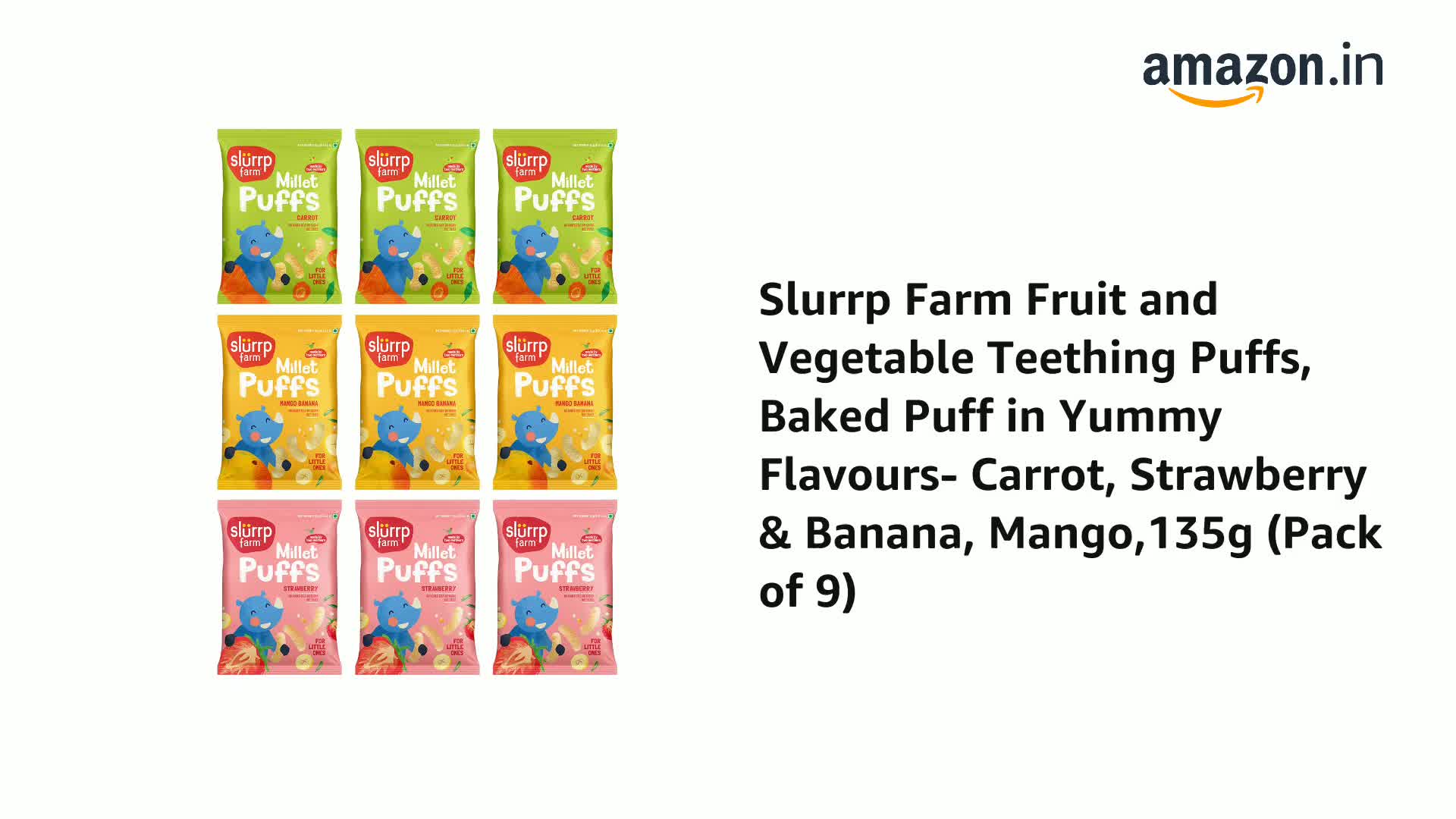 HomeGroceryCookingThe Millet StoreSlurrp Farm No Salt No Sugar Teething Puffs | Baked Fruit and Vegetable Millet Puffs | Carrot, Strawberry & Banana, Mango | Pack of 9