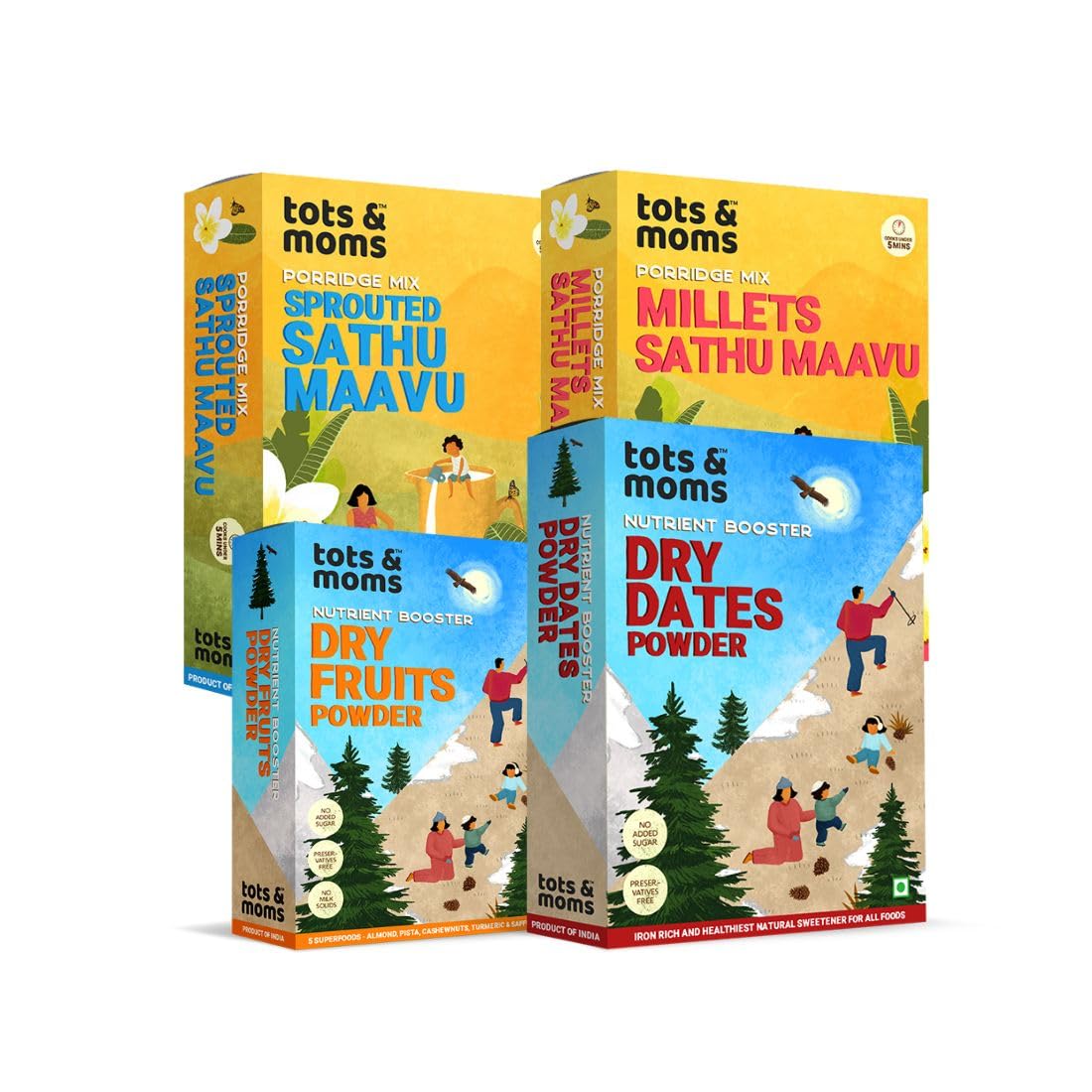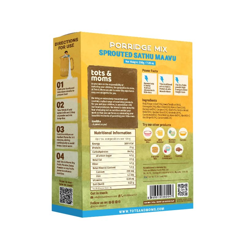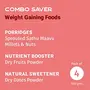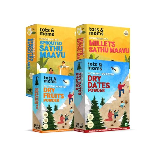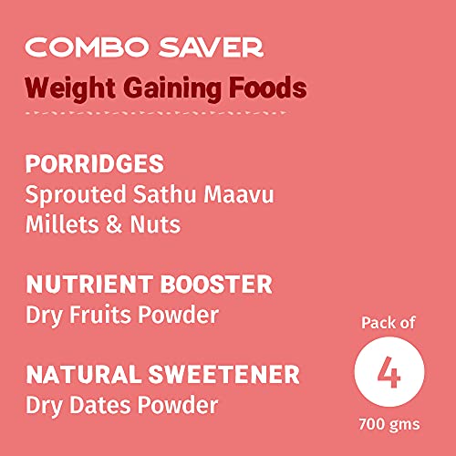Nutritious and filling Tots and Moms Weight Gaining Foods Combo Pack of 4 are special foods that help in healthy weight gain by tapping into the natural nutrients of Sprouted Sathu Mavu Millets & Nuts Dry Fruits Powder and Dry Dates Powder. Bringing together the essential porridge mix of Sathu Maavu with a combination of sprouted fresh grains cereals seeds nuts dry fruits and dates powder these foods help weight gain are blood enhancers iron-rich with all essential nutrients and help in boosting brain power and concentration. Their good fats build and sustain weight required for the growth of children and they can be prepared by cooking in water or milk on low flame.