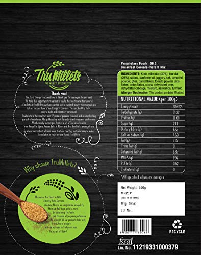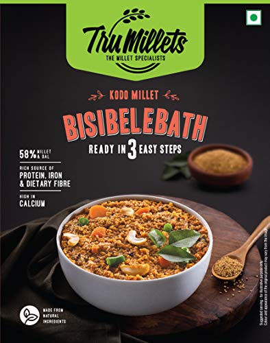 Welcome to the tasty healthy world of Millets. An authentic popular recipe from Karnataka Bisebelebath is a perfect mix of nutrition and flavor. Trumillets Bisebelebath Mix is loaded with the goodness of Millets making it an absolutely Healthy Protein and Fiber Rich sumptuous meal that’s so easy to make. Add a spot of Ghee to enhance taste and serve it with Boondi or Potato Wafers. Each Pack makes up to 3-4 Servings.