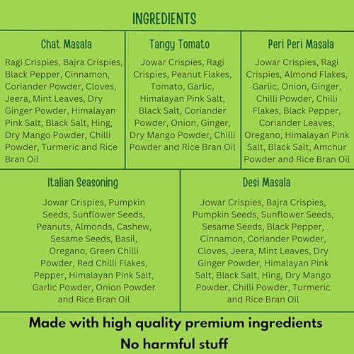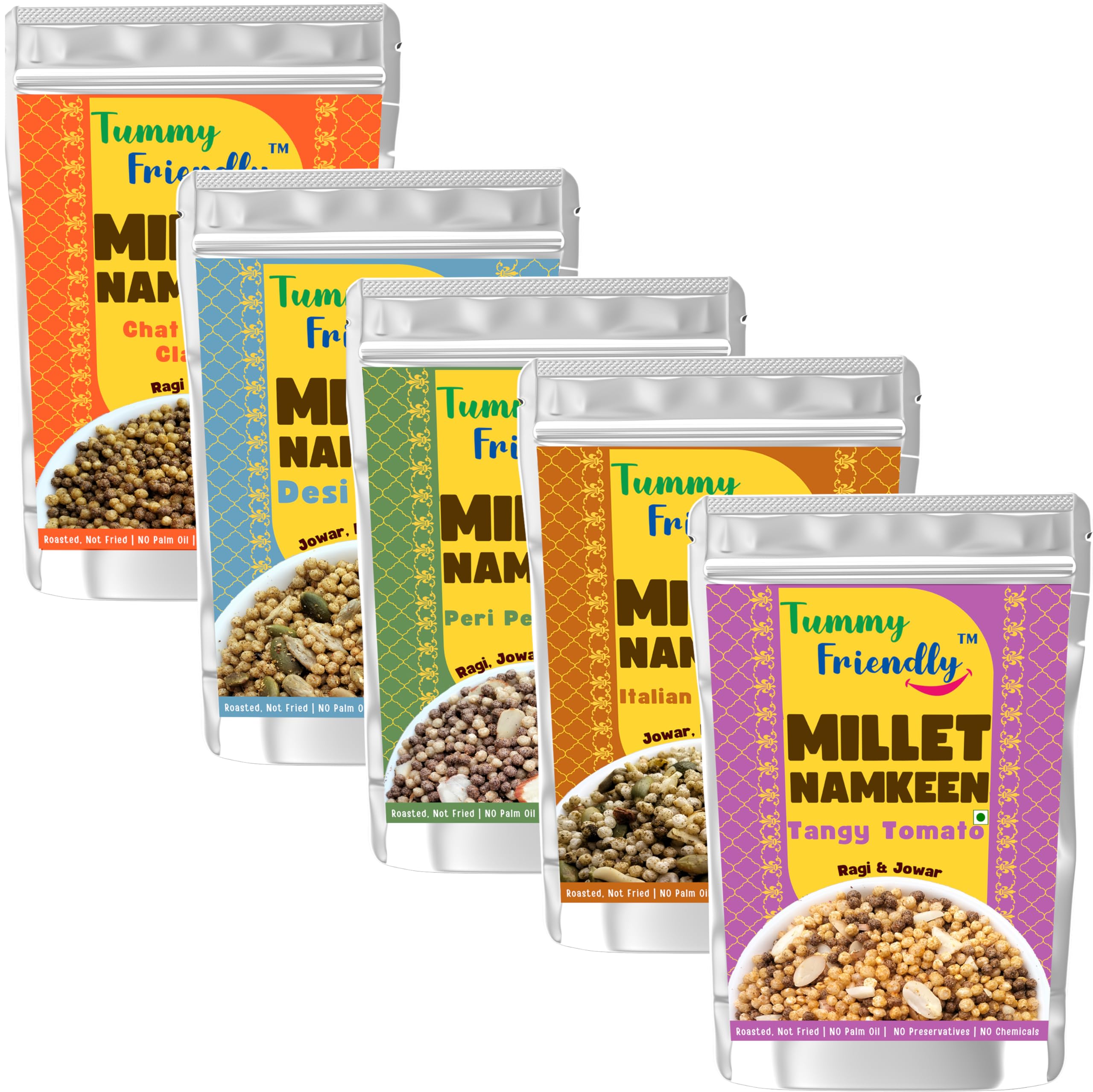 Introducing Healthy Millet Snacks â the perfect combination of taste and nutrition crafted for all ages! Made from 100% roasted millet our snacks are a wholesome alternative to traditional chips and namkeen. Whether you're looking for millet snacks for kids healthy options for adults or a snacks combo pack for the whole family these delicious bites are ideal for everyone. No Chemicals No Preservatives. Key Features: Healthy snacks for kids & adults packed with fiber and nutrients. Ready-to-eat millet snacks for busy days tea-time or as a light meal. A guilt-free crunchy chips replacement for health-conscious individuals. Suitable as snacks for diabetic patients pregnant women or those on a weight-loss journey. Available in snacks combo packs and as a thoughtful snacks gift. Versatile options like millet namkeen and millet snacks healthy to suit every occasion. Upgrade your snacking habits with our millet snacks healthy range â a delightful nutritious treat for all!
