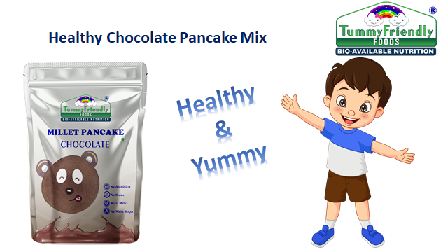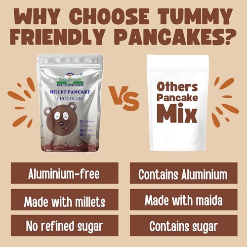 TummyFriendly Foods Aluminium-Free Chocolate Pancake Mix | Healthy Instant Breakfast Mix | Millet Pancake Mix with Super-Grains and Chocolate | Chocolate Pancake Mix | 1 pack - 800 grams. Introducing our delectable Chocolate Pancake Mix a wholesome treat that satisfies your cravings while nourishing your body. Perfect for breakfast or anytime you need a sweet pick-me-up our mix is carefully crafted with premium ingredients to ensure a delightful culinary experience. Here's why our Chocolate Pancake Mix is a must-have: Indulge your taste buds guilt-free with our heavenly Chocolate Pancake Mix the perfect blend of decadence and health. Crafted with wholesome ingredients our healthy pancake mix ensures you start your day right. Specially formulated for kids and adults alike our chocolate pancake mix is a delightful twist on a classic breakfast staple. Each bite bursts with rich cocoa flavor making breakfast an exciting affair for the whole family. Our pancake mix powder is not just convenient but also nutritious packed with essential nutrients to fuel your morning. Made with premium ingredients it's the perfect instant breakfast mix for busy mornings. With our pancake mix powder you can whip up fluffy chocolatey pancakes in minutes making mornings a breeze. Say goodbye to bland breakfasts and hello to a delicious slurp-worthy start to your day!