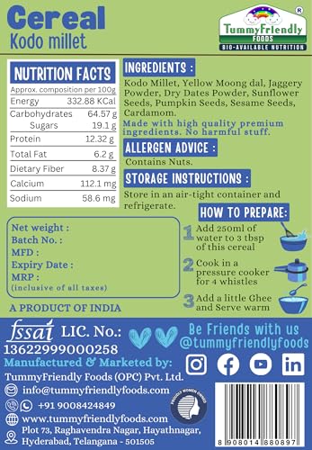 TummyFriendly Foods Foxtail Millet Little Millet & Kodo Cereal for baby Toddler kids 2 year old | Baby food for 2+ year old | Maximum Nutrition From Real Food. Available in Trial Baby Packs too. 300g (100g each). Introducing our Organic Multi Grain Health Mix Powder - the ultimate health drink for kids! Crafted with care and packed with goodness this nutritious blend is specially formulated to provide essential nutrients for growing children. Say goodbye to sugar worries! Our health drink for kids without sugar offers a healthy option for parents seeking wholesome alternatives. Made with natural ingredients it's a deliciously healthy choice that kids will love. Created with the well-being of children in mind our health mix for kids is homemade with love. We understand the importance of nourishing your little ones with the best which is why our blend is free from artificial additives and preservatives. Suitable for ages 2-6 years our health mix for kids malt is designed to support their growth and development. With a rich combination of grains it's a powerhouse of nutrients that helps fuel their active lifestyles. Looking for a Healthy Milk Mix powder for kids? Look no further! Our Health mix for kids is the perfect solution. Packed with vitamins and minerals it's an easy and convenient way to ensure your child gets their daily dose of goodness. Make the switch to our Organic Multi Grain Health Mix Powder today and give your kids the gift of health and vitality. With every sip they'll be nourished energized and ready to take on the world!